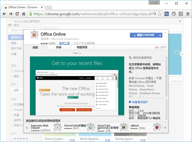首頁瀏覽器擴充功能文書編輯 Office Online 微軟推出用 Chrome 瀏覽器就能開啟、編輯 Office 文件的擴充功能 沒有安裝微軟的 Office 文書編輯軟體,又需要能夠開啟 Word、Excel、PowerPoint、OneNote 及 Sway Online 等文件,最簡便的方法,其一是直接使用微軟的 OneDrive 雲端硬碟,這個方法必須到 OneDrive 內才能存取檔案,步驟有點多,再來就是在 Chrome 瀏覽器安裝微軟自家推出的 Office Online 擴充功能,但還是需要 OneDrive 的帳號,該擴充功能可以讓更快速的開啟與編輯 Office 檔案,不過編輯的功能稍嫌陽春點,但對簡單編輯還是可以應付的。 🔔 不錯過任何精彩! 立即訂閱我們的 LINE 官方帳號 每次發佈新文章時,您將會第一時間收到本站文章連結通知,輕鬆掌握最新資訊! 使用 LINE 追蹤文章更新 §相關文章,還可以參閱:Web2PDFConverter 網頁轉 PDF 格式,可設密碼保護、列印及編輯保全Google chrome 瀏覽器外掛 Chromepad 記事本 如何安裝及使用 Office Online 擴充功能? 1.使用 Chrome 瀏覽器到達 Office Online 安裝網址後,按下[ +加到 CHROME ]便會開始下載及安裝。 2.安裝完成後,會出現提示與擴充功能的圖示按鈕。 3.第一次使用需先登入你的 OneDrive 帳戶。 4.登入後,再次點擊該圖示,便會列出存放在 OneDrive 內的 Office 檔案。 Office Online性質:免費官方網站:https://chrome.google.com/webstore/detail/microsoft-365/ndjpnladcallmjemlbaebfadecfhkepb