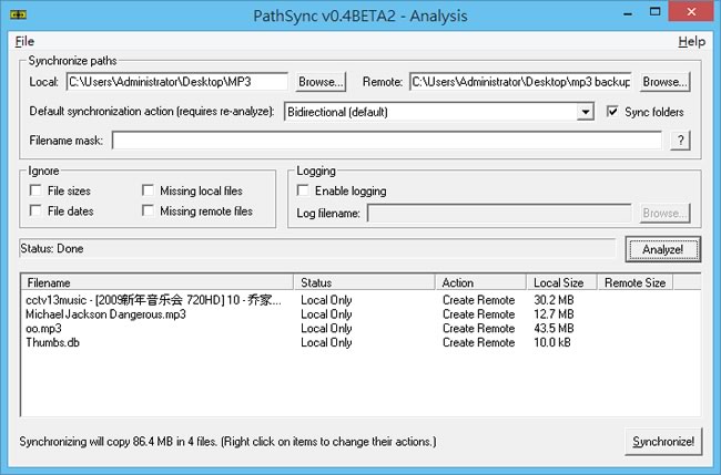 首頁電腦軟體檔案管理 PathSync 資料夾內檔案比對與同步免費工具 要知道兩個相近資料夾內的檔案,例如作業中與備份的資料夾內檔案有何不同,如果要靠人工比對,檔案數少還可以接受,但當檔案太多,大概就只能靠工具來輔助,PathSync 應用程式可以協助我們比較兩個資料夾內不同的檔案,如果需要進行同步也可以選擇基準資料夾來進行同步或反向、雙向。 🔔 不錯過任何精彩! 立即訂閱我們的 LINE 官方帳號 每次發佈新文章時,您將會第一時間收到本站文章連結通知,輕鬆掌握最新資訊! 使用 LINE 追蹤文章更新 §相關文章,還可以參閱:檔案好多重複怎麼辦?免費 dupeGuru 幫你一鍵清出電腦空間[ 免費使用 ]PDFgear 整合各種 PDF 工具,具格式轉換、編輯、合併或拆分等功能7-Zip 檔案壓縮與解壓縮免費軟體AmoK Exif Sorter 讓照片按拍照日期重新命名並自動分類的免費軟體PDF Unshare 限制 PDF 檔案的讀取有效日期 如何使用 PathSync 來比較資料夾內檔案與同步? 1.完成安裝,開啟 PathSync 後,各在 Local 與 Remote 處點擊[ Browse... ]來選擇要比對的資料夾。 2.接下來,點擊[ analyze! ]來比較,Status 會告訴你檔案所處位置。 3.要進行同步時,預設是使用「Bidirectional」為雙向同步,可以在 Default synchroization action 處,進行選擇。 4.最後,按下[Synchronize! ]進行同步。 PathSync版本:0.4 beta2語言:英文性質:免費適用:Windows官方網站:https://www.cockos.com/pathsync/下載:按我下載