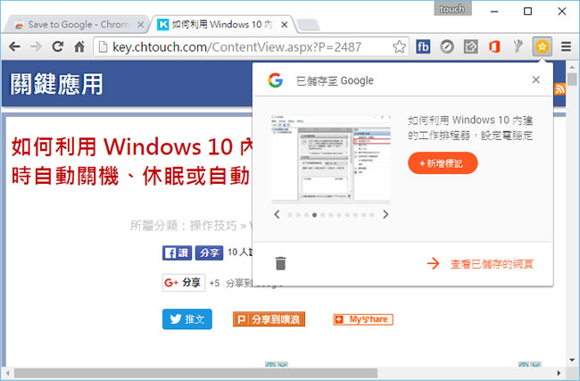 首頁瀏覽器擴充功能生產力工具 Save to Google 網頁書籤功能,更方便的儲存網頁及圖片 - Chrome 瀏覽器擴充功能 瀏覽器可能是大家使用最頻繁的軟體之一,每當有好看、好聽、值得收藏的文章,多數人可能就會直接分享、然後將其網址記錄到書籤( IE、Edge 瀏覽器稱為我的最愛 )內,方便日後可以再次回味,因此,書籤的重要性不言可喻,Google 致力於書籤功能的研究,包含開啟新分頁所出現使用率高的網站、書籤跟著帳號走等,這次,Save to Google 也是由 Google 推出,讓書籤功能在進化,讓擷取過的圖片或網頁都能在這裡預覽,並且為每則資料自訂標籤與筆記註解,有點像是 Microsoft Edge 瀏覽器建立網頁筆記的功能。 🔔 不錯過任何精彩! 立即訂閱我們的 LINE 官方帳號 每次發佈新文章時,您將會第一時間收到本站文章連結通知,輕鬆掌握最新資訊! 使用 LINE 追蹤文章更新 §相關文章,還可以參閱:Bing Chat sidebar for Chrome 讓 Chrome 在側邊欄就能使用 Bing Chat(瀏覽器擴充功能)如何在 Chrome 瀏覽器也能使用全新的 Bing AI?「UseChatGPT.AI」快速編寫、改寫、總結、解釋或翻譯網站上的任何文章 (瀏覽器擴充功能)WebChatGPT 結合網路搜尋資料,讓 ChatGPT 整合資訊沒有時間限制(瀏覽器擴充功能)ChatGPT Prompt Genius 將 ChatGPT 對話內容完整的匯出成 PNG、PDF、MD 檔或分享網址(瀏覽器擴充功能) 如何安裝及使用 Save to Google 網頁書籤功能? 1.使用 Chrome 瀏覽器到達 Save to Google 安裝網 址後,按下[ +加到 CHROME ]便會開始下載及安裝。 2.安裝完成後,會出現提示與擴充功能的圖示按鈕。 3.當我們瀏覽網頁需要紀錄時,按下剛剛所安裝出現的 Save to Google 按鈕,便會如下圖,讓你選擇網頁內的圖片、新增標記等,紀錄後的資訊可按[ 查看已儲存的網頁 ]。 Save to Google性質:免費官方網站:https://chrome.google.com/webstore/detail/save-to-google/meoeeoaohbmgbocpdpnjklmfmjjagkkf