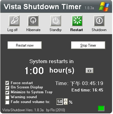 首頁電腦軟體系統應用 Vista Shutdown Timer 設定電腦定時自動關機、休眠或自動重開機﹝免安裝﹞ Vista Shutdown Timer 是一套可設定電腦定時自動關機、休眠或自動重開機的免費且免安裝應用程式,可不要以為軟體名稱有 Vista 應該是只適用於 Vista 系統,Vista Shutdown Timer 適用於 Windows 2000 / XP / Vista / 7 等系統,有需要的朋友可以下載後來試試。 🔔 不錯過任何精彩! 立即訂閱我們的 LINE 官方帳號 每次發佈新文章時,您將會第一時間收到本站文章連結通知,輕鬆掌握最新資訊! 使用 LINE 追蹤文章更新 §相關文章,還可以參閱:CatLock:可鎖定鍵盤的 Windows 應用程式,防止寵物意外觸碰Zen Ad blocker 瀏覽器與應用程式均適用的廣告攔截器,免費且開放原始碼TimVer 一站式顯示 Windows 版本及電腦硬體相關訊息的工具「微軟電腦管家」內含開機啟動項目管理、儲存空間最佳化等免費工具 全方位提升電腦效能Windows Startup Timer 測量 Windows 從開機到完全啟動所需時間 如何使用 Vista Shutdown Timer? 1.下載後直接執行「Vista-ShutdownTimer.exe」便可開啟主程式,不需要安裝。 2.點擊要進行的動作,例如要重新開機,點擊[Restart],若點擊[Restart Now]則立即進行重新開機程序,若想定時可在Restart in 或 Selected time 內設定時間,設定好之後,點擊[Rum Timer]便開始計時。 3.若想開始關機前能得到提示,可以將 [On Screen Display 在螢幕上提示關機時間]或 [Warning Sound 警告提示音]勾選,若想停止可點擊[Stop Timer]停止計時。 4.提示訊息會出現在電腦視窗右上角。 Vista Shutdown Timer 並無排程的功能,只能設定於當日的時間來執行,或是透過設定分鐘數來取巧,若需要排程來解決電腦重新開機,可參考 善用Windows 7內建的工作排程器,設定電腦定時自動關機、休眠或自動重開機! Vista Shutdown Timer版本:1.8.3a語言:英文性質:免費適用:Windows官方網站:http://www.vistashutdowntimer.toflo.de/下載:按我下載