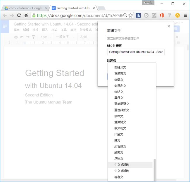 首頁操作技巧Google 文件 如何利用「Google 文件」將 PDF 內容翻譯成各國語言? 不論取得的 PDF 內容是英文、中文還是其他國家的語言,想要翻譯成自己或對方看得懂的文字語言,不需要再將 PDF 轉成文字檔,然後,複製內文貼到翻譯工具上,翻譯好,再轉成 PDF 檔案,這樣的動作實在太麻煩了。現在僅需要透過 Google Drive 雲端硬碟中的「Google 文件」來開啟 PDF 檔案,便能將內文翻譯成自己所選的語言,相當方便。 🔔 不錯過任何精彩! 立即訂閱我們的 LINE 官方帳號 每次發佈新文章時,您將會第一時間收到本站文章連結通知,輕鬆掌握最新資訊! 使用 LINE 追蹤文章更新 §相關文章,還可以參閱:「Google 文件」如何輸入分數?「Google 文件」共用文件如果有被編輯過或加入註解如何收到通知?「Google 文件」如何使用智慧型方塊插入 Google 地圖?「Google 文件」段落如何縮排?如何在「Google 文件」編輯電子郵件草稿後直接使用 GMail 預覽及發送? 如何利用「Google 文件」將 PDF 內容翻譯成各國語言? 1.使用瀏覽器登入Google Drive 雲端硬碟,利用 Google 文件開啟要翻譯的 PDF 文件。 2.開啟後,使用上方工具列的[ 翻譯文件 ]功能。 3.預設會以 PDF 檔案名稱作為翻譯文件的檔案名稱;並選擇要翻譯的語言。 4.稍候一下,便可看到翻譯的成果,可以利用工具列的檔案 > 下載格式功能,將翻譯好的文件轉 PDF 或其他文件格式。