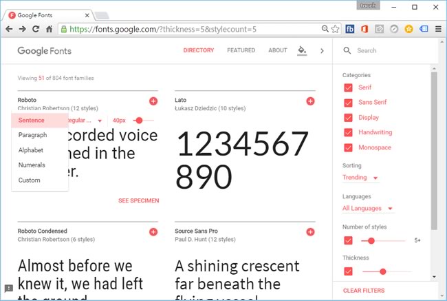 Google 自家所推出的 Google Fonts 字型免費下載網站,不僅僅只有英文字型可供下載,更提供越南、孟加拉、阿拉伯...等多語言(沒有中文),讓需要的使用者更快速的找到想要的組合,比起前一版來說,這版可讓搜尋者預覽字型的方式更為多元,不但提供網站使用,更可一次打包下載所要的字型,讓你應用在其他文書或圖片編輯軟體上,相當方便。