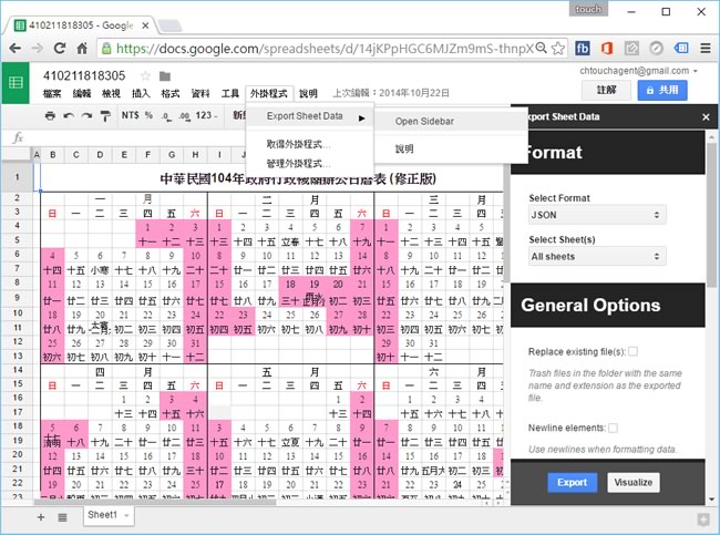 首頁操作技巧Google 試算表 如何將 Google 試算表匯出成 JSON 或 XML 的資料交換格式? 想要將 Google 試算表內的資料,匯出成 JSON 或 XML 的資料交換格式,方便後續的應用,可以來安裝 Export Sheet Data 這個外掛程式,輕輕鬆鬆就能將試算表內的資料轉成 XML 或 JSON。 🔔 不錯過任何精彩! 立即訂閱我們的 LINE 官方帳號 每次發佈新文章時,您將會第一時間收到本站文章連結通知,輕鬆掌握最新資訊! 使用 LINE 追蹤文章更新 §相關文章,還可以參閱:「Google 試算表」如何讓儲存格的寬度、高度大小都相同?「Google 試算表」如何使用 SEQUENCE 函數傳回有序數字陣列?「Google 試算表」如何計算兩個數字之間的差異百分比?「Google 試算表」如何計算儲存格中不重複值個數?「Google 試算表」如何免計算就可得知所圈選儲存格內的加總、平均值、最大及最小值? 如何使用 Export Sheet Data ? 1.使用瀏覽器進入 Export Sheet Data 外掛程式安裝網頁,點擊[ +免費 ],便會開始安裝。 2.同意存取權限。 3.完成上述安裝程序後,開啟要匯出資料的試算表,點擊[外掛程式]來開啟剛剛安裝的功能,匯出時,可選 JSON 或 XML 格式,最後,點擊[ Export ]來匯出,匯出的檔案,同樣會儲存在 Google 雲端硬碟內。