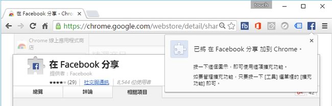 首頁線上工具社群與通訊 Share to Facebook 讓你在 Chrome 瀏覽器上就有 FaceBook 分享按鈕 閒逛網路世界,對於有價值的文章、好看的影片、實用的資訊要分享給 FaceBook 上的朋友,如果該網站沒有安裝分享按鈕,通常我們的做法就是複製該網址到 FaceBook 上來分享,若嫌麻煩,現在可以在 Google Chrome 瀏覽器安裝由 FaceBook 官方所製作的 Share to Facebook 分享按鈕擴充功能,直接分享,簡化分享手續。 🔔 不錯過任何精彩! 立即訂閱我們的 LINE 官方帳號 每次發佈新文章時,您將會第一時間收到本站文章連結通知,輕鬆掌握最新資訊! 使用 LINE 追蹤文章更新 §相關文章,還可以參閱:Meta AI 讓 Facebook 大頭貼會動了!還有動態背景、照片風格轉換新玩法馬上爆富超好用!LINE Bank × 胸毛公寓招財貼圖,農曆新年免費領取馬年行大運!精選8款新春招財LINE免費貼圖,OPEN將、罐頭豬陪你過好年「LINE 社群」也能開店!打通聊天到下單的最後一哩路存發票也能玩遊戲!LINE 發票管家改版重點一次看 如何安裝及使用 Share to Facebook ? 1.使用 Chrome 瀏覽器到達 Share to Facebook 安裝網址後,按下[ +加到 CHROME ]便會開始下載及安裝。 2.安裝完成後,會出現提示與擴充功能的圖示按鈕。 3.當有想要分享到 Facebook 資訊時,就按下剛剛所安裝的按鈕,就會出現 Facebook 的登入介面,登入後,即可分享。 Share to Facebook網站網址:https://chrome.google.com/webstore/detail/share-to-facebook/kbgplcfihfeioiaddclapccnefggiddn
