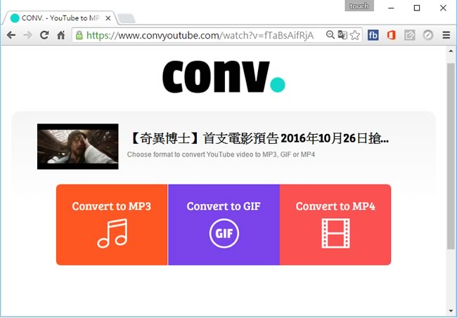 首頁線上工具上傳下載 CONV. 線上就可將 YouTube 影片轉成 MP3、GIF 或 MP4 下載 YouTube 影片成千上萬,造就 YouTube 周邊軟體的發展,其中當屬影片下載與轉成 MP3 最為熱門,CONV. 也是其中的一個線上應用,只需將 YouTube 影片網址貼上,便可 轉成 MP3、GIF 或是 MP4 影片下載,簡單好用。 🔔 不錯過任何精彩! 立即訂閱我們的 LINE 官方帳號 每次發佈新文章時,您將會第一時間收到本站文章連結通知,輕鬆掌握最新資訊! 使用 LINE 追蹤文章更新 §相關文章,還可以參閱:M3U8 Player:本地瀏覽器處理,播放、下載、轉 MP4 一站免費完成getM3U8 免費線上工具:輕鬆下載 M3U8 串流影片並轉檔 MP4SnapWC 免費影片下載器:一鍵搞定 YT、IG、FB、抖音等 10,000+ 平台影片、音訊、圖片需要分享圖片連結?試試 PiXhost 免費圖床服務P2PFileShare 線上 P2P 傳檔免費工具,免安裝無檔案大小限制直接瀏覽器傳輸 如何使用 CONV. 將 YouTube 影片轉成 MP3、GIF 或 MP4 下載? 1.使用瀏覽器進入 CONV. 網站會有使用說明,其方法就是將 YouTube 影片網址加上一個 conv (如下圖紅色框所示) ,變成 convyoutube.com 就能下載影片。 貼上。 2.接下來就可選擇你要的選項。 3.以選擇 MP3、MP4 為例,按下後,便會跳轉倒轉檔頁面,最後,按[ Convert ]待轉檔程序完成後,便可下載。 CONV.網站網址:https://www.convyoutube.com/