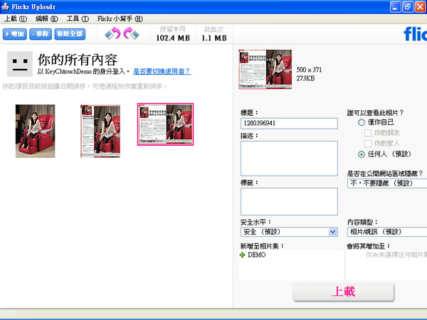 首頁電腦軟體上傳下載 Flickr Uploadr 讓上傳相片或視訊到 Flickr 網站,變得更簡單更方便 如何讓視訊或相片要上傳到 Flickr 網站裡,變得更簡單更方便呢?其實在 Flickr 網站裡就有提供 Flickr Uploadr 這樣的免費工具可以使用,可滿足大量上載的需要,或用於離線相片管理。可拖放單個相片或視訊,或選擇整個資料夾。甚至可重新排列相片在所有相片中的顯示順序,功能還不錯用。 🔔 不錯過任何精彩! 立即訂閱我們的 LINE 官方帳號 每次發佈新文章時,您將會第一時間收到本站文章連結通知,輕鬆掌握最新資訊! 使用 LINE 追蹤文章更新 §相關文章,還可以參閱:VidBee 免費開源影片下載器:RSS 自動訂閱 × 4K 高畫質 × 全球 1000+ 網站,一鍵搞定ArrowDL 全平台下載利器:輕鬆批量下載 YouTube、BT、FB與多站串流影片YouTubePlaylistDownloader 支援播放清單與頻道的 YouTube 影片下載工具,還能轉換格式Parabolic 讓 yt-dlp 更好用的免費影音下載工具,支援上千個網站的影音下載Hasleo Windows ISO Downloader 幫你從微軟網站下載原版 Windows ISO 檔 如何使用Flickr Uploadr? 1.下載並安裝,安裝完成後,開啟「Flickr Uploadr」主程式,首先會要求將你在 Flickr 的帳號,授權給 Flickr Uploadr 這個工具程式來使用,點擊[繼續]。 2.接下來就會出現收權範圍,點擊[好的,我授權]。 3.同意之後,回到Flickr Uploadr的主介面,點擊[準備就緒],基本上就可以開始上傳相片或視訊了,點擊[增加]後,在其出現的選擇相片視窗中單選或多選相片。 4.確定要上傳的相片後,點擊[上載],便會開始上傳。 5.若要上傳的過程中,透過 Flickr Uploadr 調整相片大小,可以點選上方功能表[工具] > [偏好]裡,進行設定。 Flickr Uploadr版本:3.2.1語言:繁體中文(多國語言)性質:免費適用:Windows官方網站:http://www.flickr.com/下載:按我下載
