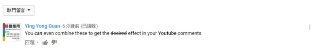 首頁操作技巧Google 如何讓 YouTube 的留言能產生粗體、斜體等變化? 在 YouTube 觀看影片後,如果有心得想要留言或鼓勵影片所有權人,通常我們看到的都是輸入的原始文字,不能加入 HTML 語法讓字體有所變化,但是如果只是要讓字體變粗、斜體或在文字中加入橫槓,還是可以辦到的。 🔔 不錯過任何精彩! 立即訂閱我們的 LINE 官方帳號 每次發佈新文章時,您將會第一時間收到本站文章連結通知,輕鬆掌握最新資訊! 使用 LINE 追蹤文章更新 §相關文章,還可以參閱:別再只會用兩指縮放 Google 地圖了!這些隱藏手勢讓你效率翻倍照著做就會!Google 官方釋出 NotebookLM 簡報製作的 8 種範例教學機車族專屬!Google Maps 推出 5 款超萌機車圖示 × 8 種顏色,設定步驟看這篇Google Skills:3000+ 門課程助你打造 AI 時代競爭力Google Vids 全解析:一文看懂功能、免費版限制及完整操作步驟 語法: 效果 使用符號 範例 Bold * *chtouch* chtouch Italic _ _chtouch_ chtouch Strike-through - -chtouch- chtouch 如何讓 YouTube 的留言能產生粗體、斜體等變化?
