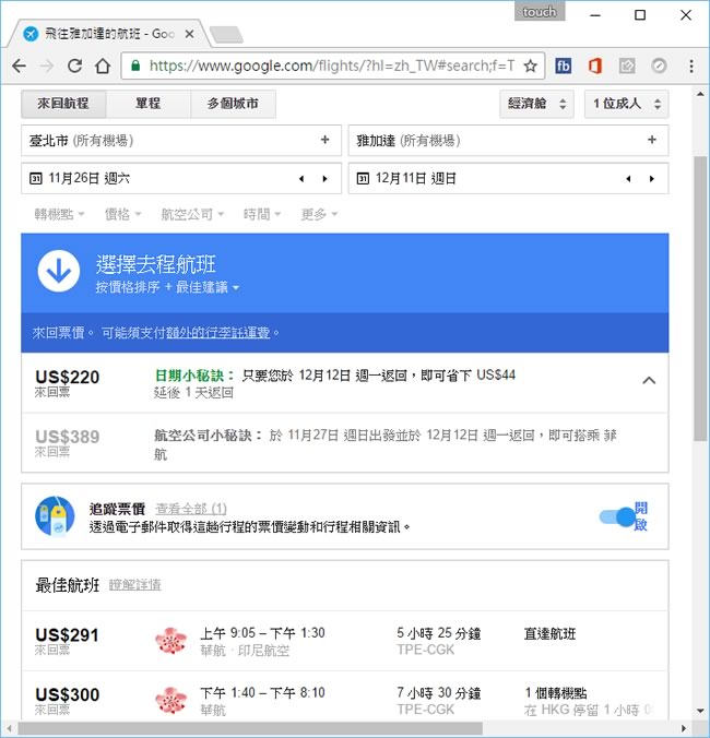 首頁線上工具生活資訊 善用 Google Flights 來追蹤機票漲價或降價 常出國旅遊或出差,對機票的價格變動一定很在意,常常有空時,就會上網查詢機票價格,但往往是早買不一定是最便宜,晚買也不見得會是最貴,常常錯過最價購買時機,不過這個情況,可以透過 Google 航班 來改善,我們可以透過 Google 地圖直接挑選想去的地點,輸入追蹤時間,就能幫你找出航班,並有各家航空公司的機票價格、所有機型及機上提供的服務等,在追蹤的期間內價格如果有變化,還能透過電子郵件自動通知,相當方便。 🔔 不錯過任何精彩! 立即訂閱我們的 LINE 官方帳號 每次發佈新文章時,您將會第一時間收到本站文章連結通知,輕鬆掌握最新資訊! 使用 LINE 追蹤文章更新 §相關文章,還可以參閱:臺北捷運QR乘車碼上路!支付業者、信用卡感應、轉乘優惠完整攻略Disney+ 跨年追劇清單!2025年末7部台韓美陸劇+1部必看演唱會電影2026台北跨年全攻略:演唱會時間地點、完整卡司名單、101煙火轉播懶人包Gemini 新年賀卡來了!日本郵便推出『#Gemini で年賀状』服務,9種模板3種尺寸任選悠遊卡搭3次雙北捷運送20%悠遊付現金回饋券,登錄規則、限制看這篇 如何使用 Google Flights 來追蹤機票漲價或降價? 1.使用瀏覽器進入 Google 航班 網站,挑選所要行程、出發的城市、目的地、時間、艙等、人數等,進行查詢。 2.查詢的結果會有最佳建議,此最佳建議是根據其上方轉機點、價格、航空公司、時間等參數來進行篩選,可自行更改;如果要追蹤此一時間段的機票價格,可開啟追蹤票價功能。 3.選擇去程航班,就可看到該航班所用機型、提供服務及相關資訊。 4.選擇回程航班,同樣可得飛行的相關資訊,並開始訂票。 Google Flights網站網址:https://www.google.com/flights/?hl=zh_TW