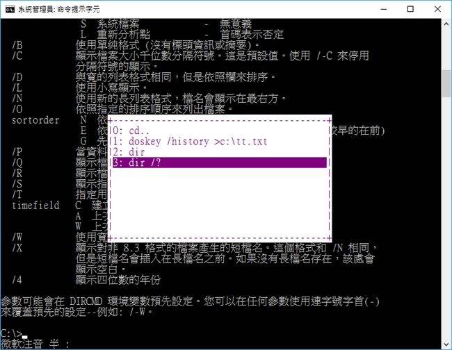 首頁操作技巧Windows 指令 如何查看與儲存在「命令提示字元」中所執行過的指令? 在 Windows 作業系統中,要執行的功能大都以圖形介面包裝起來,利用滑鼠便可操作,方便更多的使用者使用,而「命令提示字元」則可讓使用者輸入 DOS 指令來操作相關的功能,對進階使用者反而覺得方便。以前使用「命令提示字元」時,相當的不方便,不能複製、貼上、不能儲存或查看輸入的指令等等,但這些在 Windows 10 中得到改善,讓「命令提示字元」更好用。 🔔 不錯過任何精彩! 立即訂閱我們的 LINE 官方帳號 每次發佈新文章時,您將會第一時間收到本站文章連結通知,輕鬆掌握最新資訊! 使用 LINE 追蹤文章更新 §相關文章,還可以參閱:如何測試 SSD 速度?Windows 內建指令一行搞定硬碟測速如何在 Windows 中一次建立多個資料夾如何在 Windows 中使用 PowerShell 列出軟體安裝與解除安裝記錄如何使用「命令提示字元」或「PowerShell」指令取得目前 CPU 溫度?「Windows PowerShell」如何將指令結果直接輸出成文字檔? 如何查看與儲存在「命令提示字元」中所執行過的指令? 1.在「命令提示字元」中所輸入可執行的命令中,可以透過鍵盤的上、下鍵來重複顯示指令,但無法使用清單的方式列出,現在透過[ F7 ],將可列出本次執行「命令提示字元」期間中輸入的所有指令清單。 ※要關閉指令清單,可以按鍵盤[ esc ]鍵 2.上述的指令清單,同樣可以使用 doskey /history 指令直接輸出。 3.如果要儲存本次的指令清單,可以使用 doskey /history >"儲存的路徑",例如: doskey /history >c:\cmd.txt