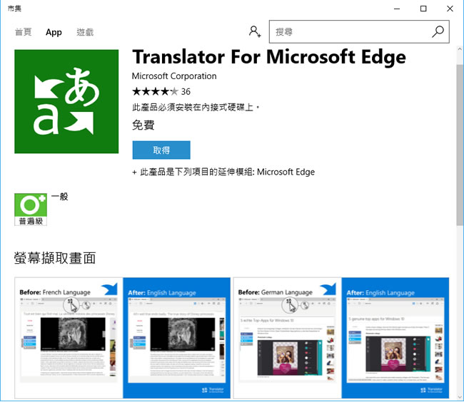 首頁瀏覽器擴充功能翻譯辨識 Translator for Microsoft Edge 讓微軟的 Edge 瀏覽器瀏覽網頁時也能有翻譯的功能( Edge 瀏覽器擴充功能 ) 對需瀏覽國外網站且外語又不好的人來說,估計大都會選用 Google 的 Chrome 瀏覽器進行瀏覽,原因無他,主要就是該瀏覽器有很好的翻譯功能,雖說不能百分百,但也八九不離十,總比什麼都看不懂還要找字典查來得好,Windows 10 內建的為 Edge 瀏覽器,相同的問題,現在只要安裝 Translator for Microsoft Edge 擴充功能,便能讓你像使用 Chrome 翻譯般的方便,讓瀏覽網站也能無國界般的方便。 🔔 不錯過任何精彩! 立即訂閱我們的 LINE 官方帳號 每次發佈新文章時,您將會第一時間收到本站文章連結通知,輕鬆掌握最新資訊! 使用 LINE 追蹤文章更新 §相關文章,還可以參閱:Mouse Tooltip Translator:滑鼠懸停即時翻譯,支援 PDF、OCR、TTS 與 YouTube 雙字幕各大廟宇線上求籤、祈福免費服務[ Edge、Chrome ]利用 Google Dictionary 翻譯網頁內的英文單字Copyfish 輕鬆翻譯網頁與圖片上的文字 - Chrome 瀏覽器擴充功能「新同文堂」 中文網頁繁簡互相轉換 - 瀏覽器擴充功能 如何安裝與使用 Translator for Microsoft Edge 擴充功能? 1.使用 Microsoft Edge 瀏覽器進入 https://aka.ms/msedge-mstranslator-store 網站,便會啟用 「Windows 市集」,點擊[ 取得 ],便會自動開始下載與安裝。 2.完成安裝後,會出現提示。 3.開啟後,可對他進行設定或解除該擴充功能。 4.實際運用時,當瀏覽不是預設語言時,網址列就會出現翻譯圖示,供你點選使用。 Translator for Microsoft Edge性質:免費官方網站:https://aka.ms/msedge-mstranslator-store
