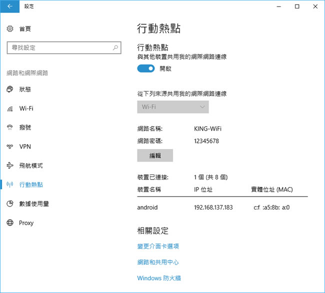 首頁操作技巧Windows 如何將 Windows 的網路變成行動熱點? 對需帳號、密碼且限制連線數的無線網路而言,例如家用的光纖、ADSL 網路、中華電線或是縣市政府的 iTaiwan、iTaipei ...等無線熱點,一個帳號同一時間只允許一個裝置上網,這對有多個裝置要上網的用戶來說,就需要購買 IP 分享器來做應用,相當不方便,如果可以將這個聯線的網際網路透過 Windows 作業系統連上,然後再利用 Windows 10 內建的行動熱點功能轉成無線熱點,讓其他裝置共用該網際網路,將會是很方便且經濟的做法。 🔔 不錯過任何精彩! 立即訂閱我們的 LINE 官方帳號 每次發佈新文章時,您將會第一時間收到本站文章連結通知,輕鬆掌握最新資訊! 使用 LINE 追蹤文章更新 §相關文章,還可以參閱:你的 Windows 筆電是真睡還是裝睡?一個設定終結背包發熱耗電學起來!微軟親授 10 個提升 Windows PC 效能的技巧如何升級 Windows 11 25H2?最新版本功能亮點與完整更新步驟Windows 工作列時鐘顯示秒數:真的會影響電池續航力嗎?LTT Labs 完整實測解析Windows 快速取出資料夾檔案名稱清單!內建功能輕鬆搞定,不用額外軟體 如何將 Windows 的無線網路變成行動熱點? 1.開啟 Windows 設定視窗 > 點擊[ 網路和網際網路 ] > 切換到[ 行動熱點 ]頁籤。 2.開啟行動熱點功能,預設會給出網路名稱與網路密碼,可點擊[ 編輯 ]進行修改;另外控制台的網路連線也會多出一個虛擬網卡。 3.接下來,開啟要連線的裝置來搜尋剛剛的網路名稱,並輸入密碼便可連上。 4.連上的同時,Windows 會顯示連線裝置的資訊,在工作列中的通知訊息欄中,亦可快速檢視。