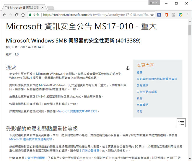 1.下載並安裝 Microsoft 在 2017 年 3月修補程式,可以透過 Windows Update 來更新或進入 https://technet.microsoft.com/en-us/library/security/ms17-