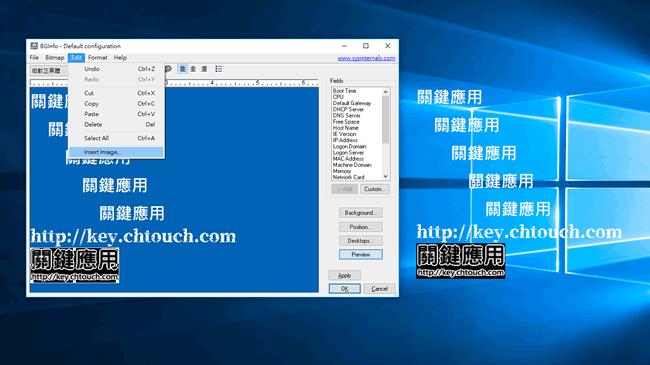 首頁電腦軟體視窗桌面 BgInfo 在桌面背景顯示系統訊息或加入自訂文字或圖片 每次要查看 Windows 系統中的訊息,例如每個磁碟機剩餘的空間、開機時間、IP 位置、登入的網域與主機....等等,都要來回的餐做一次才要辦法得知,如果可以將這些常用的資訊直接先是在桌面上,每次需要這些資訊只要回到桌面便可得知,BgInfo 可以將上述的資訊直接顯示在桌面背景上,如果這些資訊都不要,也可以將其全部刪除來加入自訂的文字訊息或圖片。 🔔 不錯過任何精彩! 立即訂閱我們的 LINE 官方帳號 每次發佈新文章時,您將會第一時間收到本站文章連結通知,輕鬆掌握最新資訊! 使用 LINE 追蹤文章更新 §相關文章,還可以參閱:Windows 官方桌布商店來了!超過 400 款風格包,從遊戲到國家公園通通有微軟 City Art Search 自動將 10400多幅世界名畫設置成 Windows 鎖定螢幕畫面Digital Clock 4 可靈活自訂的桌面時鐘,支援報時、計時器、鬧鐘等多款附加套件TrafficMonitor 在 Windows 桌面上顯示網路上傳與下載的即時網速「免費下載」故宮博物院 2023 兔年月曆桌布 如何使用 BgInfo? 1.解壓縮所下載的檔案,第一次執行「BgInfo.exe 或 BgInfo64.exe」會有授權條款,可以按[ Agree ]來同意。 2.開啟 BgInfo 後,就有預設的系統訊息顯示,可根據自己的需求進行刪減,並點擊[ Preview ]來預覽。 3.如果都不想要這些資訊,也可以將其全部刪除,加入自訂的文字或圖片。 4.Background 按鈕,可以沿用系統所設置的桌面參數,或是改變桌面。 5.Position...按鈕,可以改變要文字要顯示在背景的位置。 BgInfo版本:4.22語言:英文性質:免費適用:Windows官方網站:https://technet.microsoft.com/en-us/sysinternals/bb897557.aspx下載:按我下載