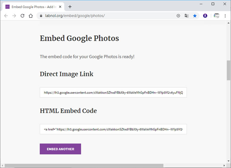 首頁操作技巧Google 如何將「Google 相簿」內的相片嵌入網頁中? 「Google 相簿」除了提供有條件的儲存無限容量的圖片外,並會將上傳的圖片自動按人物、地點、事物進行歸類,方便用戶搜尋,且也會在適當的時機以美術拼貼的方式,提醒用戶回顧以前的圖片,另外也可以儲存影片、動畫及電影,儲存這麼多的圖片,如果要將圖片放到網頁中分享,該如何才能達成呢?透過 Embed Google Photos 這個免費網站,我們將可以將儲存在「Google 相簿」內的圖片,輕鬆轉換成 Direct Image Link 或是 HTML Embed Code,只要複製這些語法,就可以將圖片應用到網頁中,相當方便。 🔔 不錯過任何精彩! 立即訂閱我們的 LINE 官方帳號 每次發佈新文章時,您將會第一時間收到本站文章連結通知,輕鬆掌握最新資訊! 使用 LINE 追蹤文章更新 §相關文章,還可以參閱:別再只會用兩指縮放 Google 地圖了!這些隱藏手勢讓你效率翻倍照著做就會!Google 官方釋出 NotebookLM 簡報製作的 8 種範例教學機車族專屬!Google Maps 推出 5 款超萌機車圖示 × 8 種顏色,設定步驟看這篇Google Skills:3000+ 門課程助你打造 AI 時代競爭力Google Vids 全解析:一文看懂功能、免費版限制及完整操作步驟 如何將相片從「Google 相簿」嵌入進網頁? 1.進入「Google 相簿」先取得單張相片的分享 URL 連結,其步驟為點擊要取得 URL 的相片。 2.再按圖片上方的[ 分享 ]按鈕。 3.建立連結。 4.複製所產生的 URL 連結。 5.進入 Embed Google Photos 網站,將複製的相片 URL 連結貼上,並勾選[ 我不是機器人 ]後,再按[ GENERATE ]。 6.稍後,便可取得圖片連結的相關語法,複製該語法就可以貼到網頁中來使用。