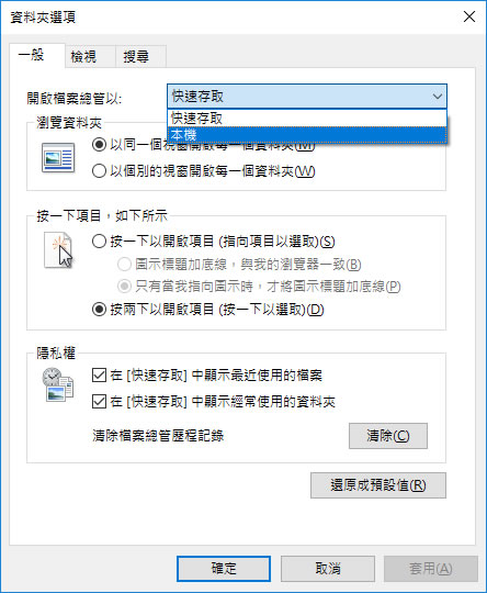 首頁操作技巧Windows [ Windows ]檔案總管開啟時,如何直接進入「本機」而不是「快速存取」? Windows 10 在開啟檔案總管時,預設是直接顯示「快速存取」的內容,也就是顯示使用者最近存取檔案的紀錄,方便歸方便,但有隱私問題,那麼該如何來調整呢? 🔔 不錯過任何精彩! 立即訂閱我們的 LINE 官方帳號 每次發佈新文章時,您將會第一時間收到本站文章連結通知,輕鬆掌握最新資訊! 使用 LINE 追蹤文章更新 §相關文章,還可以參閱:你的 Windows 筆電是真睡還是裝睡?一個設定終結背包發熱耗電學起來!微軟親授 10 個提升 Windows PC 效能的技巧如何升級 Windows 11 25H2?最新版本功能亮點與完整更新步驟Windows 工作列時鐘顯示秒數:真的會影響電池續航力嗎?LTT Labs 完整實測解析Windows 快速取出資料夾檔案名稱清單!內建功能輕鬆搞定,不用額外軟體 如何讓 Windows 開啟檔案總管時,直接進入「本機」而不是「快速存取」? 1.開啟檔案總管視窗,使用滑鼠右鍵點擊[ 快速存取 ],再點擊[ 選項 ]。 2.接下來便會開啟「資料夾選項」視窗,我們可以在開啟檔案總管以處,進行調整成「本機」。 3.如果電腦是多人共用,有隱私考量,在隱私權處,也可以將[ 在[快速存取]中顯示最近使用的檔案 ]與[ 在[快速存取]中顯示最近使用的資料夾 ] 2個選項取消勾選,並且按[ 清除 ]按鈕,將現有的記錄消除。