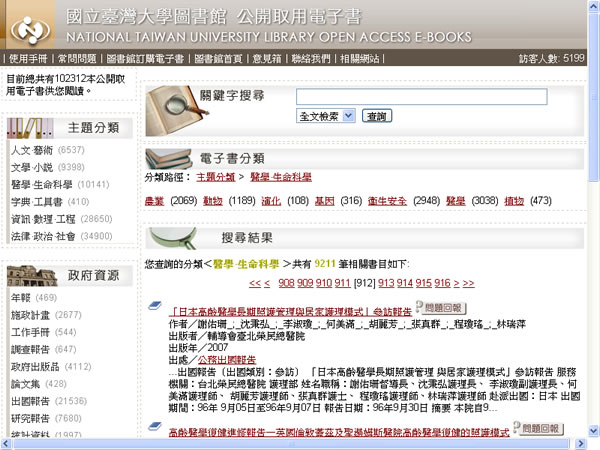 首頁線上工具電子書與閱讀 國立臺灣大學圖書館,公開取用電子書 國立臺灣大學圖書館,所提供的公開取用電子書,內容涵蓋有「人文‧藝術」、「文學‧小說」、「醫學‧生命科學」、「字典‧工具書」、「資訊‧數理‧工程」、「法律‧政治‧社會」,政府資源「年報」、「工作手冊」、「政府出版品」...等及博碩士論文「成功大學」、「中山大學」、「東華大學」與「世新大學」,如果要查資料、做報告或喜歡在網上閱讀的朋友,可以進來挖寶喔! 🔔 不錯過任何精彩! 立即訂閱我們的 LINE 官方帳號 每次發佈新文章時,您將會第一時間收到本站文章連結通知,輕鬆掌握最新資訊! 使用 LINE 追蹤文章更新 §相關文章,還可以參閱:SaltyLeo 的書架:愛書人必收藏!百萬電子書免費搜尋與下載金庸網:讓你免費閱讀所有金庸小說全集及人物介紹破萬卷小說網:線上小說免費閱讀與下載,支援下載成 TXT文字檔Wikiprint 讓維基百科可以列印出易於閱讀的模式,還可自選要列印的目次Feedrabbit 用 EMail 免費訂閱網站最新文章 如何使用臺灣大學圖書館公開取用電子書? 1.進入到「臺灣大學圖書館*公開取用電子書」後,左邊欄為電子書分類,可以點擊各分類來找尋所需要的電子書。 2.或使用關鍵字搜尋,輸入關鍵字後,點擊[搜尋]。 3.若要觀看該電子書,點擊書名便會開啟預設的PDF閱讀器。 臺灣大學圖書館 公開取用電子書網站網址:http://ebooks.lib.ntu.edu.tw/Home/ListBooks