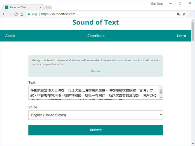 首頁線上工具影音視聽 Sound of Text 文字轉 Google 語音 MP3 檔 透過「Google 翻譯」或是手機安裝 Google「文字轉語音」 APP,便能輕易將文字使用語音來讀出,但如果要儲存讀出的語音,你可能還需要有錄音的應用程式來支援,Sound of Text 這個免費網站,可以讓我們直接在文字框內輸入文字,就可轉換成 Google 翻譯支援語言的語音,並將語音自動轉換成 MP3 檔,讓你下載,這對影片製作中需要有不同聲音來輔助時,相當有幫助。 🔔 不錯過任何精彩! 立即訂閱我們的 LINE 官方帳號 每次發佈新文章時,您將會第一時間收到本站文章連結通知,輕鬆掌握最新資訊! 使用 LINE 追蹤文章更新 §相關文章,還可以參閱:FFmpeg.guru 免費線上影片工具:轉檔、壓縮、剪輯、加浮水印全包,還能離線使用YouTube Premium Lite 升級!背景播放、離線下載全開放,月費仍維持 119 元Google 親授!Google Lyria 3 用文字、圖片創作音樂的 6 個技巧sound&go 耳機測試工具:免安裝測左右聲道、頻率響應Veo 3.1「材料轉影片」功能升級:支援直式影片與 4K 畫質 如何使用 Sound of Text? 1.使用瀏覽器進入 Sound of Text 網站,在 Text 文字框中輸入要轉語音的文字,並在 Voice 處,選擇要使用的語言。 2.選擇好之後,按[ Submit ],便會該段文字列在按鈕後段中,並標示所要讀出的語言,可點擊[ Play ]來試聽,也可以點擊[ DOWNLOAD ]來下載。 3.上述語音檔。 Sound of Text網站網址:https://soundoftext.com/