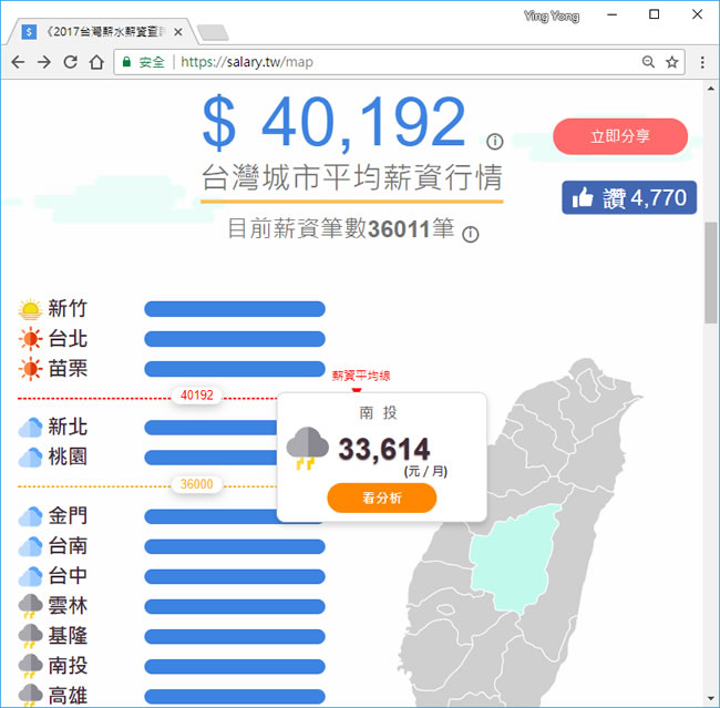 首頁線上工具生活資訊 「台灣薪資地圖」幫你算算薪資排名 每個月勞動而來的薪資,領得再多,應該也有人會嫌少,至於「多」要如何定義?你可以將自己的薪資拿來在「台灣薪資地圖」這個網站內做個比較,其將台灣城市平均薪資行情、全台薪水分佈區間、年資vs.薪資散布做成圖表,方便你一目瞭然,當然,你也可以輸入自己的薪資所得與大家比較一下,年底想換工作,也可查詢全台產出年薪百萬最多人及其公司,至於,該網站的可信度,因為不是政府給出的統計數據,大家參考就好。 🔔 不錯過任何精彩! 立即訂閱我們的 LINE 官方帳號 每次發佈新文章時,您將會第一時間收到本站文章連結通知,輕鬆掌握最新資訊! 使用 LINE 追蹤文章更新 §相關文章,還可以參閱:Apple Music 台灣新用戶優惠:6個月免費暢聽,領取方式與限制一次看!2026春節追劇清單!Netflix 2月必看攻略:燒腦推理、火爆動作片,陪你從初一爽追到開工!459 萬人搶 60 萬份!運動幣中獎號碼公布,快查你的身分證尾數都馬一起GO!LINE GO新年優惠最高拿$800優惠券,還有一個月乘車金等你抽過年搭高鐵自由座要排多久?看LINE就知道 台灣高鐵×LINE TODAY推出春節限定燈號預估服務 如何使用「台灣薪資地圖」? 1.使用瀏覽器進入 「台灣薪資地圖」 網站,就可以看到城市的平均薪資,當然,詳細還是要看以下的圖表。 2.再往下捲動,還可以看到「全台薪水分佈區間」圖表,右側的誰年薪百萬,可以讓你查詢各縣市的薪資狀況與公司。 3.回到原畫面最後,網站還提供「年資vs.薪資散布圖」參考,畢竟年資與薪資是緊緊相扣。 4.當然,自己的薪資究竟是個甚麼狀況,在網頁的開頭有個[ 比薪水 ]的功能可以點擊,進入後,輸入資己的月薪,便可知你贏過多少人。 台灣薪資地圖網站網址:https://salary.tw/map