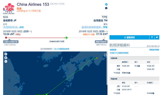 首頁線上工具生活資訊 FlightAware ✈追蹤你關注的航班動態資訊,準時接機不空等 每年總有些特定的假期驅使在海外工作、讀書的人回到台灣探視親友或從事特定活動,如果要去接機,可以來參考 FlightAware 這個網站所提供的航班飛行資訊,從起飛,飛到哪裡,預計降落時間讓你隨時動態掌握,避免提早到機場空等,浪費時間又浪費金錢。 🔔 不錯過任何精彩! 立即訂閱我們的 LINE 官方帳號 每次發佈新文章時,您將會第一時間收到本站文章連結通知,輕鬆掌握最新資訊! 使用 LINE 追蹤文章更新 §相關文章,還可以參閱:Apple Music 台灣新用戶優惠:6個月免費暢聽,領取方式與限制一次看!2026春節追劇清單!Netflix 2月必看攻略:燒腦推理、火爆動作片,陪你從初一爽追到開工!459 萬人搶 60 萬份!運動幣中獎號碼公布,快查你的身分證尾數都馬一起GO!LINE GO新年優惠最高拿$800優惠券,還有一個月乘車金等你抽過年搭高鐵自由座要排多久?看LINE就知道 台灣高鐵×LINE TODAY推出春節限定燈號預估服務 如何使用 FlightAware 網站所提供的航班動態資訊? 1.使用瀏覽器進入 FlightAware 網站,便可看到台灣上空與周邊正在飛行的飛機。 2.輸入班機編號來取得包含剩餘的飛行時間及其他更詳盡的動態資料。 FlightAware網站網址:https://zh-tw.flightaware.com/live/