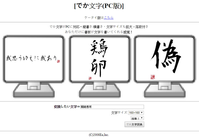 首頁線上工具影像繪圖 免費書法字體產生器,可選直書或橫書與字體大小 書法是應用很廣且受很多人喜歡的字體,不過要將手寫的書法應用到電腦中,可不是件簡單的事情,「でか文字」是一個日本網站,只要輸入中文便能產生書法字體,但不能保證每個中文字都有,字體大小有 160×160、320×320、640×640 可選擇,另外,也可選擇要直式書寫還是橫式書寫,並產生 JPG 圖檔。 🔔 不錯過任何精彩! 立即訂閱我們的 LINE 官方帳號 每次發佈新文章時,您將會第一時間收到本站文章連結通知,輕鬆掌握最新資訊! 使用 LINE 追蹤文章更新 §相關文章,還可以參閱:跟著做就會!教你用 ChatGPT 製作具職業形象的漫畫風頭像Put!所見即所得的 AI 提示詞圖庫:讓你看著範例圖,複製就能做出同級作品Google 親自示範:Nano Banana AI 圖像編輯工具的 13 個熱門玩法照片角度不滿意?AI 幫你調整!3D Camera Control 讓舊照片任意變換視角Meta AI 免費帳戶也能用 Midjourney!無限生成 AI 圖片,台灣可用 如何使用 でか文字產生毛筆字? 1.使用瀏覽器進入 でか文字 網站,在変換したい文字⇒輸入要顯示的字體大小,在 文字サイズ 選擇要顯示的字體大小與橫書或直書後,按[ でか文字変換 ]。 2.產生的直書與橫書,下載圖片後,便可做後續的應用。 でか文字網站網址:https://eainc.jp/dekamoji/