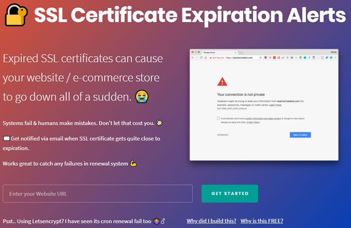 首頁線上工具資訊安全 SSL Certificate Expiration Alerts 網站憑證到期前通知免費服務 Google 要將沒有提供 SSL 安全憑證的網站,在其網址列前加入「不安全」示警,這讓很多網站開始使用 SSL 安全憑證,不論是付費或是免費,基本上 SSL 憑證都會有過期的問題,因此,網站如果已採用 SSL 憑證連線服務,就需要注意到憑證到期前要更新,SSL Certificate Expiration Alerts 這個網站主要就是提供 SSL 憑證到期前的警示服務,完全免費,只要輸入要監管的網址,就能在憑證失效的 14天前收到電子郵件通知,當憑證有效日期小於 10天便會每天通知,確保網站可順利運作。 🔔 不錯過任何精彩! 立即訂閱我們的 LINE 官方帳號 每次發佈新文章時,您將會第一時間收到本站文章連結通知,輕鬆掌握最新資訊! 使用 LINE 追蹤文章更新 §相關文章,還可以參閱:終結網路霸凌!Google 搜尋新工具幫你永久移除私密影像注意!Let's Encrypt 憑證期限從 90 天減半至 45 天,因應方法看這裡朱雀大模型檢測:騰訊推出的 AI 內容鑑別工具,精準識別 AI 生成文章與圖片如何透過「Google One」檢查 Gmail 是否因資料侵害事件外洩到暗網上?Batch PDF Encryptor 替 PDF 檔案加入擁有者與開啟密碼保全措施 免費可批量 如何使用 SSL Certificate Expiration Alerts 網站憑證到期前通知免費服務? 1.使用瀏覽器進入 SSL Certificate Expiration Alerts 網站,輸入要監管的網站網址,按[ Get Started ]。 2.接下來會顯示輸入網站 SSL 憑證的到期時間,輸入要接收通知的 Email ,點擊[ Setup Alert ]就能接收通知。 SSL Certificate Expiration Alerts網站網址:https://alerts.httpscop.com/