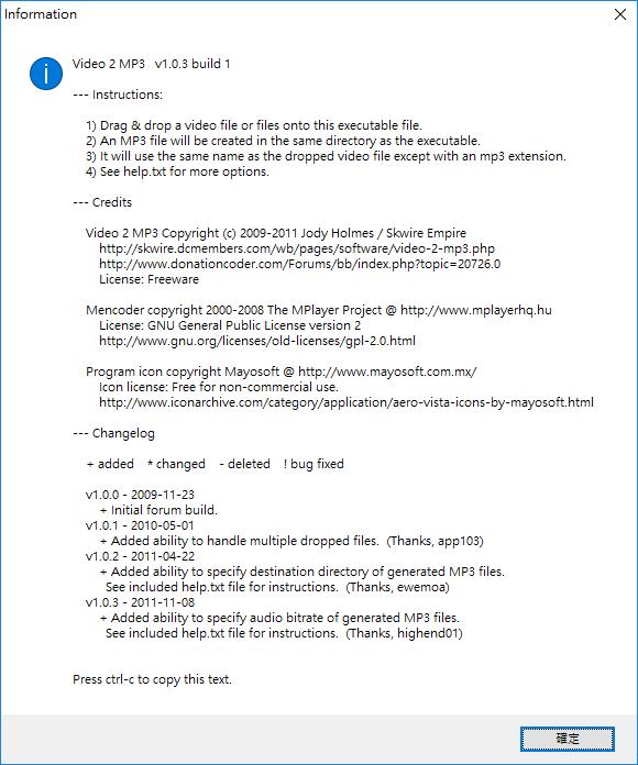 首頁電腦軟體影音視聽 Video2MP3 影片轉 MP3 免費工具 對多數的影音網站來說,都有相對應的免費下載工具,可以說影片的取得管道相當多,如果想要取出影片中的聲音,也有很多的免費工具可以應用,Video2MP3 也是其中的一款,其使用方式很簡單,只需要將影片使用滑鼠拖拉到其執行檔上方後放開就會自動幫你轉出 MP3 檔案,轉檔速度也還不錯,有需要的朋友可以試試。 🔔 不錯過任何精彩! 立即訂閱我們的 LINE 官方帳號 每次發佈新文章時,您將會第一時間收到本站文章連結通知,輕鬆掌握最新資訊! 使用 LINE 追蹤文章更新 §相關文章,還可以參閱:超實用免費軟體!DCP-o-matic 讓你的影片變成電影院 DCP 播放格式語音轉文字免費工具 AsrTools 輕鬆搞定字幕、筆記或歌詞整理免費的 PotPlayer 開始搭載 Whisper AI,讓你即時生成字幕與翻譯,外語影片輕鬆看SpleeterGUI:簡單易用的 AI 音軌分離免費開源工具如何使用 Microsoft Clipchamp 自動產生影片字幕? 如何使用 Video2MP3 將影片轉成 MP3? 1.解壓縮所下載的檔案,執行「 Video2MP3.exe 」便可開啟。 2.開啟後,就是如何操作及軟體的更新說明。 3.接下來將要轉檔的影片使用滑鼠拖拉到 Video2MP3.exe 的上方後放開,便會開始影片轉 MP3 的動作,而用戶只會在滑鼠游標處看到轉換的提示,轉出的 MP3 檔案會儲存與 Video2MP3.exe 所在的相同路徑 。 Video2MP3版本:1.0.3語言:英文性質:免費適用:Windows官方網站:https://www.dcmembers.com/skwire/download/video-2-mp3/下載:按我下載 Video2MP3