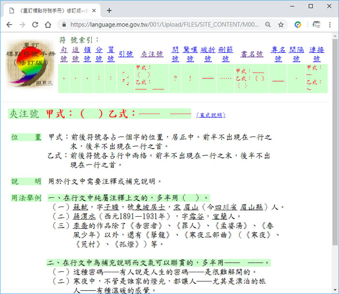 首頁教育學習國語文 教育部「重訂標點符號手冊」,複習標點符號正確的使用方法 不管是大人還是小孩,對於標點符號的使用方法,常常會有搞不清楚的時候,教育部有鑒於文書處理方式及使用習慣有所改變,為因應實際需要,有修訂句號、逗號、頓號、分號、冒號、引號、夾注號、問號、驚嘆號、破折號、刪節號、書名號、專名號、間隔號、連接號等十五種。其中,橫式「引號」改為「」『』,「連接號」為新增,「間隔號」為原「音界號」之改稱,並提供手冊下載,若不想下載也可以線上查詢,每個標點符號都有例句說明。 🔔 不錯過任何精彩! 立即訂閱我們的 LINE 官方帳號 每次發佈新文章時,您將會第一時間收到本站文章連結通知,輕鬆掌握最新資訊! 使用 LINE 追蹤文章更新 §相關文章,還可以參閱:國字標準字體筆順練習:國小各版本生字 + AI 獎勵圖卡 + 學習紀錄功能AI太炎:免費古漢語大語言模型,支援釋義、翻譯、標點與識典功能「新式九宮格作業簿」可線上自編國字練習的格子簿產生器「花蓮縣字音字形學習網」一個陪伴孩子成長、學習的最佳網站教育部線上「生字練習簿」系統,自己就可建立生字練習題,還可以加入注音空格 如何下載教育部提供「重訂標點符號手冊」? 1.進入網站後,若想直接下載,可點擊網頁最下方(pdf檔、doc檔),便可以下載或開啟。 2.若想查詢,請點擊[符號索引]進入。 3.點擊要查看的標點符號用法,例如[句號],便會有符號、位置、說明及其用法舉例等說明。 教育部「重訂標點符號手冊」網站網址:https://language.moe.gov.tw/001/Upload/FILES/SITE_CONTENT/M0001/HAU/c2.htm