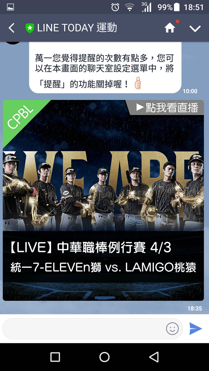 首頁線上工具生活資訊 LINE Today 直播 2018年中華職棒每場比賽 2018年中華職棒的現場轉播堪稱百家爭鳴,除了大家熟知有線電視的緯來體育台、FOX SPORTS,MOD 的愛爾達等,不過需要注意的是,有線電視是區分球隊轉播的,像是緯來轉播的是「中信兄弟 Brothers 🐘」而 FOX SPORTS 則是以「統一7-ELEVEn獅 UNLIONS 🦁」為主,如果是 MOD 的愛爾達那就沒差,那網路呢?那就用 LINE 的新聞網站 LINE Today 來收看吧,只要用 LINE 帳號登入 LINE Today,便可免費觀賞最即時的中華職棒比賽直播。 🔔 不錯過任何精彩! 立即訂閱我們的 LINE 官方帳號 每次發佈新文章時,您將會第一時間收到本站文章連結通知,輕鬆掌握最新資訊! 使用 LINE 追蹤文章更新 §相關文章,還可以參閱:小米米家電磨筆開賣!NT$969 入手纖細筆型設計,木雕、模型打磨一筆搞定史上最高12億!台彩春節大紅包連抽到元宵,銷售時間、玩法規則一次看2026年特色春聯索取指南:總統府、法鼓山、靈鷲山等重點發放據點整理辦護照預約排到 4 月?免排隊秘訣:線上有條件申換,10 個工作日搞定Apple 新一代 AirTag 登場:尋找範圍增 50%,五大升級、售價完整解析 如何使用 LINE Today 看 2018年中華職棒比賽直播? 1.使用瀏覽器進入 LINE Today 網站,按右上角的登入來加入 LINE Today。 2.註冊過程需要用手機配合將 LINE Today 加入好友。 3.完成後,便可在 LINE Today 上收看 2018年中華職棒每場比賽直播。 LINE Today網站網址:https://today.line.me/TW/pc