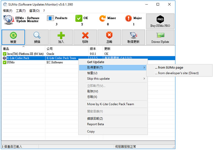 首頁電腦軟體資訊安全 SUMo 應用程式更新檢查工具 電腦除了內建的應用程式之外,或多或少都會安裝像是文書處理、壓縮/解壓縮等之類的額外應用程式,這些軟體在有更新時,不見得在原程式內有內建的更新通知,通常還是需要靠人工去檢查,SUMo 這套免費軟體,可以協助我們快速地去檢查電腦已安裝的應用程式是否有更新版,如果有更新版本,對用戶來說,可以透過該軟體去取得更新(付費版功能),也可以選擇自行到原應用程式的官網來下載更新。 🔔 不錯過任何精彩! 立即訂閱我們的 LINE 官方帳號 每次發佈新文章時,您將會第一時間收到本站文章連結通知,輕鬆掌握最新資訊! 使用 LINE 追蹤文章更新 §相關文章,還可以參閱:PDFEncrypt 替 PDF 檔案加入禁止列印、注釋、複製、修改及開啟密碼等保全限制WHDownloader 微軟 Office及 Windows 更新檔下載器Free Virtual Keyboard 虛擬鍵盤免費軟體 (螢幕小鍵盤)BlankAndSecure 讓刪除的檔案無法被還原[ Windows Server ]如何使用 win-acme 申請 Let's Encrypt SSL 並安裝到 IIS? 如何使用 SUMo 檢查已安裝的應用程式是否有更新版本? 1.完成安裝,開啟 SUMo,便可以按[ 檢查 ],已安裝的應用程式無論有無更新都會列出,有更新版本,則會在列表的第一欄出現紅色驚嘆號以茲區別。 2.使用滑鼠右鍵點擊須更新的應用程式,在其出現的功能表可以選擇取得更新(付費版功能),也可以選擇自行到原應用程式的官網來下載更新。 3.在設定的視窗中,可以更改介面語言及設定相關參數。 SUMo版本:5.15.2.524語言:中文(多國語言)性質:免費適用:Windows官方網站:http://www.kcsoftwares.com/index.php?home下載:按我下載