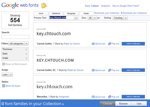 首頁免費字型字型工具 Google web fonts 由 Google 所提供的網頁字型應用服務 2012-10-4 更新 Google Font Directory 改為 Google web fonts 通常為了增加網頁的美觀,在製作網頁的時候會運用一些非 Windows 內建的字型,但是當有使用者訪問到該網頁時,除非訪客的電腦裡也有該字型,才能正常顯示,若無也只能回到預設的網頁字型,因此網頁設計者為解決這樣的問題,都會將該字型做成圖片格式來顯示。Google web fonts 是由 Google 所提供的網頁字型服務,它的出現改變原有網頁字型運用的常規,要應用時該字型時,只要連結到 Google 的所提供的 CSS 字型樣式,就能讓網頁訪客存取到相同的字型,再也不用將該字型做成圖片了。 🔔 不錯過任何精彩! 立即訂閱我們的 LINE 官方帳號 每次發佈新文章時,您將會第一時間收到本站文章連結通知,輕鬆掌握最新資訊! 使用 LINE 追蹤文章更新 §相關文章,還可以參閱:FontShow 本機字型預覽與比較免費工具,線上輕鬆篩選最佳字體Font of Web 輸入網址就幫你找出該網站所使用的字體與下載網址如何建立自己手寫的英文字型?「守寫字」讓手寫字也能變成可用電腦打出的字體FontViewOK 字型比較免費工具 如何使用 Google Font Directory? 1.進入 Google web fonts 網站後,就會看到目前所有字型樣式,可在 Preview Text 輸入要預覽的英文字。 2.滑鼠點擊 Quick-use ,便可取得可應用在網頁中的 CSS 或 Javascript 連結語法 。 3.若要取得使用範例,可點擊[See an example],便會出現如何應用到網頁的範例。 4.以下是實際應用的範例。 Google web fonts網站網址:http://www.google.com/webfonts
