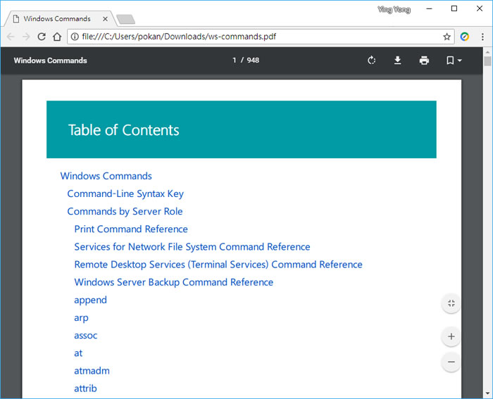 首頁操作技巧Windows 指令 「命令提示字元」Windows 指令參考指南免費下載 不論 Windows 作業系統版本如何演進,至今仍然保留「命令提示字元」這個應用程式,方便用戶可用來下達指令,大家熟知的 dir、cd、exit、copy、md....等命令,便可在「命令提示字元」中來執行,那麼 Windows 到底提供多少指令,這些指令又該如何使用,附帶的參數又有哪些功能,這對很多人來說,應該都不太知道,現在 Microsoft 將「命令提示字元」可用的指令及其參數彙整成一份 PDF 檔案,免費讓用戶下載。 🔔 不錯過任何精彩! 立即訂閱我們的 LINE 官方帳號 每次發佈新文章時,您將會第一時間收到本站文章連結通知,輕鬆掌握最新資訊! 使用 LINE 追蹤文章更新 §相關文章,還可以參閱:如何在 Windows 中一次建立多個資料夾如何在 Windows 中使用 PowerShell 列出軟體安裝與解除安裝記錄如何使用「命令提示字元」或「PowerShell」指令取得目前 CPU 溫度?「命令提示字元」如何使用指令執行 SSD 硬碟速度測試?「Windows PowerShell」如何將指令結果直接輸出成文字檔? 如何下載與使用 Windows「命令提示字元」指令參考指南 1.該參考指南只有提供英文版,按[ Download ]下載。 2.使用 PDF 閱讀器來開啟該份指南。 3.實際應用。