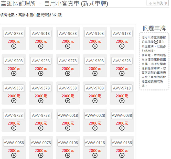 首頁線上工具生活資訊 「監理服務網」讓自己可以選全台的車牌號碼 買車時,業務員都會問對車牌號碼有沒有什麼特別要求,因為有人不要 3、不要 4,要有 8、要有 6,每個人的需求都不同,領牌員也會盡量滿足購車者的要求,而現在,不論你是自用小客貨車、租賃小客貨車、營業小客車、550cc以下重機、550cc以上重機、普通重型機車、普通輕型機車、電動550cc以下重機、電動550cc以上重機、電動普通重型機車、電動普通輕型機車的新車領牌、 重領牌、 定期換牌、 換發身障牌、 換發普通牌、遺損換牌,想要有個心目中理想的車牌號碼,可以到交通部的「監理服務網」查詢,該網站提供全台監理所車牌號碼查詢,但有選牌費及領牌時須至該號牌之管轄單位領取等限制。 🔔 不錯過任何精彩! 立即訂閱我們的 LINE 官方帳號 每次發佈新文章時,您將會第一時間收到本站文章連結通知,輕鬆掌握最新資訊! 使用 LINE 追蹤文章更新 §相關文章,還可以參閱:Apple Music 台灣新用戶優惠:6個月免費暢聽,領取方式與限制一次看!2026春節追劇清單!Netflix 2月必看攻略:燒腦推理、火爆動作片,陪你從初一爽追到開工!459 萬人搶 60 萬份!運動幣中獎號碼公布,快查你的身分證尾數都馬一起GO!LINE GO新年優惠最高拿$800優惠券,還有一個月乘車金等你抽過年搭高鐵自由座要排多久?看LINE就知道 台灣高鐵×LINE TODAY推出春節限定燈號預估服務 如何使用「監理服務網」選自己的車牌號碼? 1.使用瀏覽器進入 監理服務網-選號及轉帳作業 網站,會有個選車牌的注意事項,建議你仔細閱讀。 2.進入到選號作業後,先選擇管轄監理單位,可跨監理所、站選號(有貸款設定及租賃車輛除外),重點是領牌時須至該號牌之管轄單位領取。 3.選擇領牌地點(窗口地點)後,電話號碼會自動帶出;選擇車牌別、車牌樣式等。 4.在查詢別處,有提供查詢所有號碼、進階查詢、流標及逾期號牌查詢、新順編號碼查詢選項,已進階查詢來說,輸入的方式如下: 自訂號碼查詢:請直接輸入欲查詢之號碼 1688。 *數字*:查詢號碼含有該數字的車牌 *168*。 *數字:查詢末位數為該數字的車牌 *168、 數字*:查詢開頭為該數字的車牌 168*。 下圖示查詢含有 8的車牌號碼,接下來就可以挑自己喜歡的號碼去付費。 監理服務網網站網址:https://www.mvdis.gov.tw/m3-emv-plate/webpickno/queryPickNo#