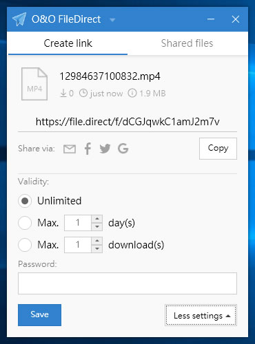 首頁電腦軟體上傳下載 O&O FileDirect 檔案分享最佳免費工具 現在的即時通訊軟體或是雲端硬碟都可以將檔案即時的分享出去,但是如果是較大的檔案,光是要上傳可能就要一段時間,加上如果要分開傳送時,那就有的等了。O&O FileDirect 這套免費的檔案傳輸工具,可直接在電腦上操作,免去要上傳的時間,直接將要傳送的檔案,化身成為一個網址,而且可以限定下載日數、下載次數或是下載前必須輸入密碼才可以下載,增加檔案的安全性,而對方在取得該網址後,也只需要開啟瀏覽器,使用取得的檔案網址便可輕鬆下載。 🔔 不錯過任何精彩! 立即訂閱我們的 LINE 官方帳號 每次發佈新文章時,您將會第一時間收到本站文章連結通知,輕鬆掌握最新資訊! 使用 LINE 追蹤文章更新 §相關文章,還可以參閱:ArrowDL 全平台下載利器:輕鬆批量下載 YouTube、BT、FB與多站串流影片YouTubePlaylistDownloader 支援播放清單與頻道的 YouTube 影片下載工具,還能轉換格式Parabolic 讓 yt-dlp 更好用的免費影音下載工具,支援上千個網站的影音下載Hasleo Windows ISO Downloader 幫你從微軟網站下載原版 Windows ISO 檔XMusicDownloader 從音樂網站搜尋並下載歌曲的免費應用程式 如何使用 O&O FileDirect 來傳輸檔案? 1.執行所下載的檔案「OOFileDirect1ENU.exe」便可開啟,無須安裝。 2.將要分享的檔案,使用滑鼠拖拉到有 Drag file(s) or folder(s) here to share 字樣的位置後放開,便會產生出檔案網址,按[ Copy ]後,傳送給要接收檔案的用戶。 3.對方收到後,開啟瀏覽器,貼上該檔案網址便可下載。 4.按[ More Settings ]可以限定檔案的分享條件。 5.切換到 Shared files 可以查看檔案分享紀錄。 O&O FileDirect版本:1.0語言:英文性質:免費適用:Windows官方網站:https://www.oo-software.com/en/filedirect下載:按我下載