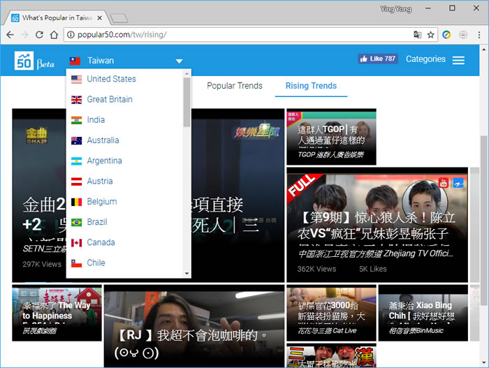 首頁線上工具生活資訊 Popular50.com 蒐羅全球各國家地區在 YouTube 最即時最熱門的前 50個影音 在 YouTube 上觀看影片,很多人其實都會觀看 YouTube 所推薦的影片,除非自己是很有針對性的搜尋某些類別的影片,至於大家現在都在看什麼呢?那些影片又是最受到大家歡迎的呢?如果想要知道這個答案,現在透過 Popular50.com 這個網站就可以輕鬆得知,該網站按照各國家地區分別篩選最即時且最熱門的影片,並且在該網站就可以觀看,不需要回到 YouTube 網站。 🔔 不錯過任何精彩! 立即訂閱我們的 LINE 官方帳號 每次發佈新文章時,您將會第一時間收到本站文章連結通知,輕鬆掌握最新資訊! 使用 LINE 追蹤文章更新 §相關文章,還可以參閱:Apple Music 台灣新用戶優惠:6個月免費暢聽,領取方式與限制一次看!2026春節追劇清單!Netflix 2月必看攻略:燒腦推理、火爆動作片,陪你從初一爽追到開工!459 萬人搶 60 萬份!運動幣中獎號碼公布,快查你的身分證尾數都馬一起GO!LINE GO新年優惠最高拿$800優惠券,還有一個月乘車金等你抽過年搭高鐵自由座要排多久?看LINE就知道 台灣高鐵×LINE TODAY推出春節限定燈號預估服務 如何使用 Popular50.com? 1.使用瀏覽器進入 Popular50.com 網站便會挑選適合你現在所在位置的前 50 個最熱門的影片,點擊便會開始播放。 2.左上角網站 logo 旁可以切換不同的國家地區。 3.點擊右上角三條橫線的圖示按鈕,可以用影片的分類來篩選。 Popular50.com網站網址:https://popular50.com/