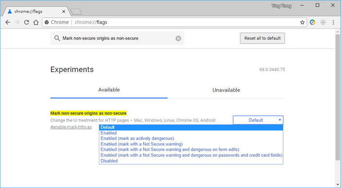 首頁操作技巧瀏覽器 如何更改 Chrome 瀏覽器在網址列對不安全的 HTTP 網頁顯示方式? Google 為推動 Https 協定不遺餘力,只要是使用 Https 協定的網頁,均會在自家 Chrome 瀏覽器網址列開頭處標示成綠色「安全」🔒 鎖頭,如果是非 Https 的網頁則會標示成 ⓘ,兩種符號,均可點擊進去看詳細資訊,而現在 Chrome 68版會將非 Https 的網頁,直接在網址列被標示「不安全」字樣,為求有提示效果,或是你想更改這個提示,可以經由 chrome://flags/ 來設定 Chrome 瀏覽器。 🔔 不錯過任何精彩! 立即訂閱我們的 LINE 官方帳號 每次發佈新文章時,您將會第一時間收到本站文章連結通知,輕鬆掌握最新資訊! 使用 LINE 追蹤文章更新 §相關文章,還可以參閱:如何在 Chrome 中顯示 / 隱藏 AI 模式按鈕?flags 設定教學Google AI 模式正式支援繁體中文:一次搞懂功能、應用與影響Edge 不用開側邊欄!網址列直接輸入提示詞就能 AI 生圖與搜圖Edge、Chrome 瀏覽器複製已開分頁到新分頁,這招你一定要學起來Edge Android 版新增底部網址列功能,來看怎麼設定 如何更改 Chrome 瀏覽器在網址列對不安全的 HTTP 網頁顯示方式? 1.預設 Chrome 瀏覽器 68版,對非 Https 網頁的顯示方式。 2.在 Chrome 瀏覽器網址列輸入 chrome://flags/ 後,按[ Enter ],接下來在搜尋框輸入 Mark non-secure origins as non-secure。 3.為求更醒目,你可以選擇 Enabled(mark as actively dangerous) 選項,選擇後,將瀏覽器重開後,便可得到更醒目的標示。