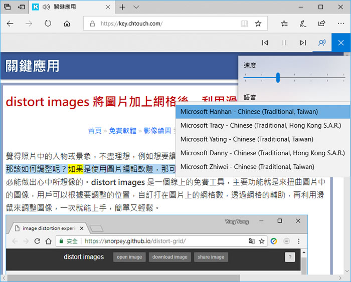 首頁操作技巧瀏覽器 如何讓 Edge 瀏覽器可以「大聲朗讀」網頁內文或 PDF 文件? 如果閱讀有障礙或是不想看螢幕時,也有人能夠將瀏覽器目前顯示的文章用語音讀出時,可以來使用 Microsoft 的 Edge 瀏覽器,透過 Edge 內建的「大聲朗讀」功能,可以將瀏覽器目前顯示的網頁或 PDF 文件使用語音來讀出,讀出的速度可以自己調整,且可選女聲或男聲,家裡有小孩要聽故事,實在沒時間時,也是一個很好的替代方案,只要找好故事的 PDF 文件,再利用 Edge 開啟,調整好速度,選擇要男聲還是女聲,就可以開始講故事了。 🔔 不錯過任何精彩! 立即訂閱我們的 LINE 官方帳號 每次發佈新文章時,您將會第一時間收到本站文章連結通知,輕鬆掌握最新資訊! 使用 LINE 追蹤文章更新 §相關文章,還可以參閱:如何在 Chrome 中顯示 / 隱藏 AI 模式按鈕?flags 設定教學Google AI 模式正式支援繁體中文:一次搞懂功能、應用與影響Edge 不用開側邊欄!網址列直接輸入提示詞就能 AI 生圖與搜圖Edge、Chrome 瀏覽器複製已開分頁到新分頁,這招你一定要學起來Edge Android 版新增底部網址列功能,來看怎麼設定 如何讓 Edge 瀏覽器可以「大聲朗讀」網頁內文或 PDF 文件? 1.使用 Edge 瀏覽器開啟任一網頁後,按右上角的三點橫線來開啟功能表,選擇「大聲朗讀」。 2.朗讀的過程可以對朗讀的速度、男聲或女聲隨時調整。 3.可以使用 Edge 瀏覽器開啟 PDF 文件,依照上述步驟來操作即可。