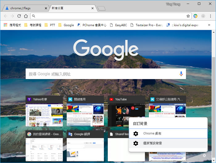 首頁操作技巧瀏覽器 如何讓 Google Chrome 瀏覽器在新增分頁時有背景圖片? Google Chrome 68 版本後,有幾項重要的變更,除了大家已知道的將不是 https 的網頁標示為不安全與將 通知功能整合到 Windows 10 之外,還有就是讓用戶可以替新增分頁增加背景圖片,將原有的單一的白色背景,透過由用戶自選 Chrome 預先提供的圖片來當作背景圖片,預設是不開啟,但可透過 chrome://flags/ 開啟設定網頁來開啟該項功能。 🔔 不錯過任何精彩! 立即訂閱我們的 LINE 官方帳號 每次發佈新文章時,您將會第一時間收到本站文章連結通知,輕鬆掌握最新資訊! 使用 LINE 追蹤文章更新 §相關文章,還可以參閱:如何在 Chrome 中顯示 / 隱藏 AI 模式按鈕?flags 設定教學Google AI 模式正式支援繁體中文:一次搞懂功能、應用與影響Edge 不用開側邊欄!網址列直接輸入提示詞就能 AI 生圖與搜圖Edge、Chrome 瀏覽器複製已開分頁到新分頁,這招你一定要學起來Edge Android 版新增底部網址列功能,來看怎麼設定 如何讓 Google Chrome 瀏覽器在新增分頁時有背景圖片? 1.要讓 Chrome 的新增分頁可以自訂背景圖片,需要透過網址列輸入 chrome://flags/ 並在搜尋中輸入 new tab page 關鍵字後,設定如下圖的兩個地方,分別為 Enable using the Google local NTP 及 New Tab Page Background Selection 將 Default 改為 Enabled 後,並按下[ Relaunch now ]重新啟動。 2.重新開啟後,當新增分頁時,便可在右下角處看到有一齒輪圖示按鈕,按下後,便可開始設定背景圖片。 3.如要還原成白色桌布,同樣可在原齒輪處設定。