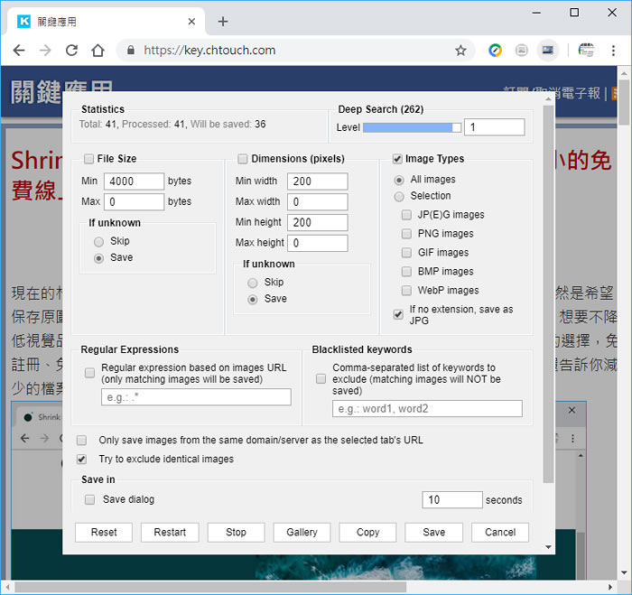 首頁瀏覽器擴充功能上傳下載 Download all Images 將網頁內含圖片一次全部打包下載 - Chrome 瀏覽器擴充功能 喜愛自網頁下載圖片的朋友,還在使用滑鼠右鍵 > 另存圖檔的一張張手動下載嗎?如果是,可以來參考 Download all Images 這個 Chrome 瀏覽器擴充功能,使用方式超簡單,到達內含圖片的網頁後,按下右上角完成安裝的 Download all Images 圖示按鈕,便可將所有的圖片拉到該擴充功能內,其可設定每個鏈結要往下搜尋圖片的階層數、篩選圖片檔案大小、解析度、所要的圖片檔案格式等等,可以全部也可以單張下載,全憑用戶需求。 🔔 不錯過任何精彩! 立即訂閱我們的 LINE 官方帳號 每次發佈新文章時,您將會第一時間收到本站文章連結通知,輕鬆掌握最新資訊! 使用 LINE 追蹤文章更新 §相關文章,還可以參閱:RedNote Video Downloader:小紅書影片下載器,免費瀏覽器擴充功能DownThemAll 讓你輕鬆下載網頁內所有檔案(瀏覽器擴充功能)「貓抓」可解析串流影片 m3u8 檔案並下載成 MP4 的瀏覽器擴充功能Apple Design Resources - Apple 官方提供的各種裝置外框、圖示、字體...等設計資源免費下載使用Mobile TikTok & Downloader 抖音影片下載瀏覽器擴充功能 如何安裝及使用 Download all Images? 1.使用 Chrome 瀏覽器到達 Download all Images 安裝網址後,按[ 加到 CHROME ]便會開始引導用戶進行下載與安裝。 2.安裝完成後,瀏覽器的右上角會出現提示與擴充功能的圖示按鈕。 3.到達內含圖片的網頁後,按下右上角完成安裝的 Download all Images 圖示按鈕,便可將所有的圖片拉到該擴充功能內,Deep Search 可設定 URL 要搜尋的深度;File Size、Dimensions 可篩選圖片的大小與解析度;按[ Save ]就可打包下載,如果要看圖檔明細,可按[ Gallery ]來挑選。 Download all Images性質:免費官方網站:https://chrome.google.com/webstore/detail/download-all-images/nnffbdeachhbpfapjklmpnmjcgamcdmm/related
