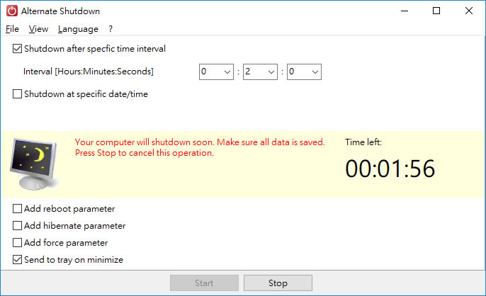 首頁電腦軟體生產力工具 Alternate Shutdown 讓電腦可以在自訂的日期時間自動關機或重新開機 想讓電腦在自己規定的時間內做出某種行為,最方便的工具莫過於使用 Windows 內建的工作排程器,不過設定步驟有些繁雜,如果需要電腦自動關機或重新啟動的行為,可以來參考 Alternate Shutdown 這套免費軟體,只要設定好時間、日期,就能讓電腦在你規定的時間做出相對應的事件。 🔔 不錯過任何精彩! 立即訂閱我們的 LINE 官方帳號 每次發佈新文章時,您將會第一時間收到本站文章連結通知,輕鬆掌握最新資訊! 使用 LINE 追蹤文章更新 §相關文章,還可以參閱:AingDesk:一鍵安裝 Ollama AI 模型管理器,讓 LLaMA、DeepSeek 在本機電腦上運行Arc 瀏覽器正式登陸 Windows 11,開啟全新瀏覽體驗!Norton Secure Browser 使用 Chromium 核心的瀏覽器,有廣告封鎖和隱私保護功能BingGPT 桌面應用程式,讓你不用 Edge 也能用 Bing 聊天機器人SlippyClerk 數字、英文字母有序字串產生器 可自訂前後綴字詞 如何使用 Alternate Shutdown? 1.完成安裝,開啟 Alternate Shutdown 後,便可設定電腦要關機的時間。 2.按[ Start ]便可啟動定時器。 3.如果要要指定日期時間,可以使用 Shutdown atspecific date/time 選項。 4.Shutdown.exe 可以包含相當多的參數可以加入,可以在 View 功能表 > [ Options ] 來做改變。 5.各項參數的意義,可以使用 Shutdown /? 來取得。 Alternate Shutdown版本:1.320語言:英文性質:免費適用:Windows官方網站:https://www.alternate-tools.com/pages/c_shutdown.php?lang=ENG下載:按我下載
