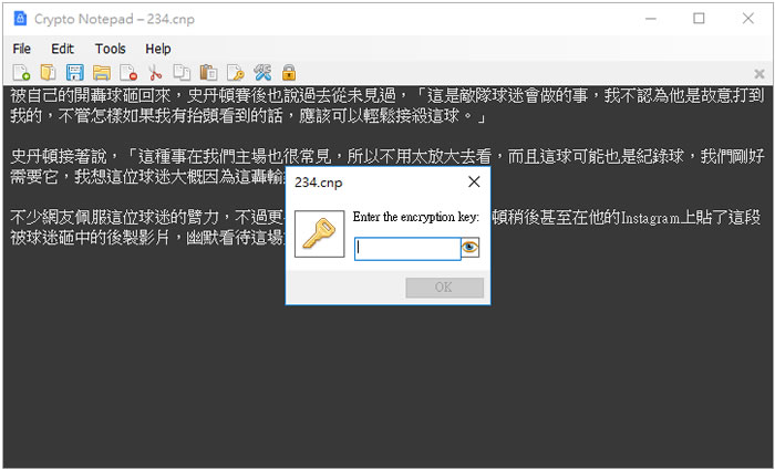 首頁電腦軟體文書編輯 Crypto Notepad 具有加密功能的記事本 Windows 內建的記事本功能簡單,開啟快速,因此,常常會被拿來做一些不需要特殊排版的紀錄,像是紀錄帳號、密碼,或是簡單需傳遞的事項,但正因為簡單好用,可開啟記事本檔案的應用程式不少,如果紀錄是不想讓他人可以輕易讀取時,可以考慮改用 Crypto Notepad 這套免費又免安裝的應用程式,如同記事本的簡單,卻可以對內文進行加密,用 Windows 內建的記事本軟體開啟時,內文也是被編碼過的,即便是對方安裝相同的應用程式,只要編碼的金鑰不同,仍然無法讀取,具有相當好的保護性質。 🔔 不錯過任何精彩! 立即訂閱我們的 LINE 官方帳號 每次發佈新文章時,您將會第一時間收到本站文章連結通知,輕鬆掌握最新資訊! 使用 LINE 追蹤文章更新 §相關文章,還可以參閱:PDF Arranger 可調整順序、刪除、旋轉...的多功能 PDF 工具程式Text Replacer 文字替換免費工具如何在 PDF 文件裡添加額外的文字、圖片、圖形或繪圖?Notepad++ 免費多功能記事本軟體doPDF 可在任何程式中藉由[ 列印 ]功能來建立 PDF 檔案 如何使用 Crypto Notepad ? 1.解壓縮所下載的檔案後,再將 Crypto-Notepad-Update.zip 一併解壓縮,然後執行 Crypto-Notepad-Update 資料夾內的「 Crypto Notepad.exe 」便可開啟,開啟後,會詢問是否要將電腦網路卡位置加入加密編碼內,該選項可以在 setting 進行調整,如果檔案要與人共用,建議不加入。 2.開啟新的檔案,就會要你輸入編碼金鑰。 3.完成編輯存檔後,利用 Windows 內建的記事本軟體開啟,內文也是被編碼過的。 4.使用 Crypto Notepad 開啟時,需要有當初正確的加密金鑰。 Crypto Notepad版本:1.7.0語言:英文性質:免費適用:Windows官方網站:https://github.com/Sigmanor/Crypto-Notepad下載:按我下載