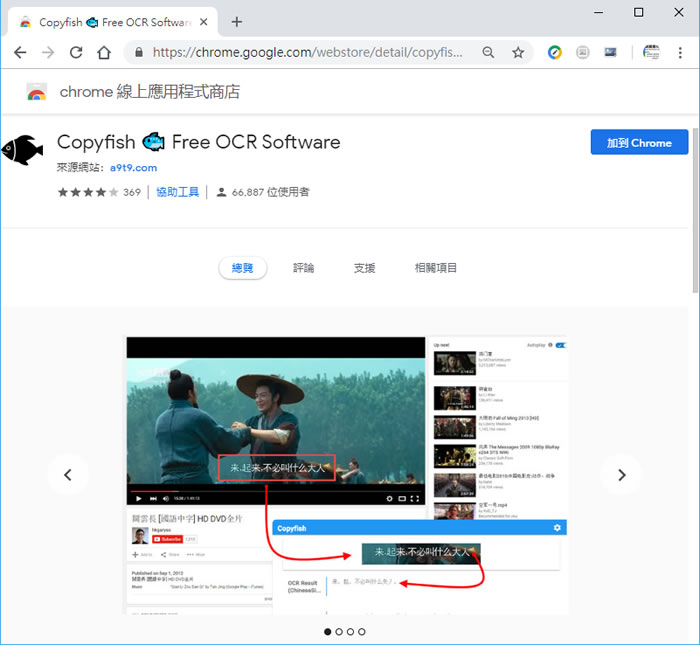 首頁瀏覽器擴充功能翻譯辨識 Copyfish 輕鬆翻譯網頁與圖片上的文字 - Chrome 瀏覽器擴充功能 Chrome 瀏覽器有內建的翻譯功能,可以協助我們瀏覽非自己龉系的網頁,但是沒辦法將網頁中圖片的內含文字也翻譯出來,是其缺點,Copyfish 這個瀏覽器的擴充功能,正好可以補足這方面的缺憾,使用時,只需將圖片圈起來,Copyfish 就會辨識圖片內的文字,並翻譯出用戶所指定語言。 🔔 不錯過任何精彩! 立即訂閱我們的 LINE 官方帳號 每次發佈新文章時,您將會第一時間收到本站文章連結通知,輕鬆掌握最新資訊! 使用 LINE 追蹤文章更新 §相關文章,還可以參閱:Mouse Tooltip Translator:滑鼠懸停即時翻譯,支援 PDF、OCR、TTS 與 YouTube 雙字幕各大廟宇線上求籤、祈福免費服務[ Edge、Chrome ]利用 Google Dictionary 翻譯網頁內的英文單字Translator for Microsoft Edge 讓微軟的 Edge 瀏覽器瀏覽網頁時也能有翻譯的功能( Edge 瀏覽器擴充功能 )「新同文堂」 中文網頁繁簡互相轉換 - 瀏覽器擴充功能 如何安裝及使用 Copyfish ? 1.使用 Chrome 瀏覽器到達 Copyfish 安裝網址後,按[ 加到 Chrome ]便會開始引導用戶進行下載與安裝。 2.安裝完成後,瀏覽器的右上角會出現提示與擴充功能的圖示按鈕。 3.Copyfish 並不會自動辨識語言,需用戶自行指定是其缺點,可用滑鼠右鍵點擊其圖示按鈕,在選項內設定。 4.使用時,點擊安裝後出現的 Copyfish 圖示按鈕,便會將現行網頁套上遮罩,並提示你選擇區域,當區域選擇完後,便會自動彈出翻譯結果,。 Copyfish性質:免費官方網站:https://chrome.google.com/webstore/detail/copyfish-%F0%9F%90%9F-free-ocr-soft/eenjdnjldapjajjofmldgmkjaienebbj