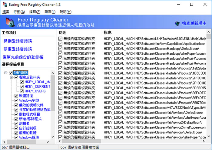 首頁電腦軟體資訊安全 Eusing Free Registry Cleaner - Windows 登錄檔修復免費軟體,加快電腦效能 Windows 作業系統中的登錄檔( Registry )是一個重要的資料庫,用來儲存系統和應用程式的設定資訊,但很多人都會發現,移除一個應用程式後,常常會遺留下一些資料夾、檔案或是在[ 開始 ]功能表還有該應用程式...等等,移除過的程式越多,效能就越慢,如何讓這些已經移除的程式、資料夾、檔案能夠徹底地消失,或是修復存在的錯誤呢?Eusing Free Registry Cleaner 這套免費的應用程式可以協助我們做這件事情,透過註冊表的掃描,找出並修復錯誤。 🔔 不錯過任何精彩! 立即訂閱我們的 LINE 官方帳號 每次發佈新文章時,您將會第一時間收到本站文章連結通知,輕鬆掌握最新資訊! 使用 LINE 追蹤文章更新 §相關文章,還可以參閱:PDFEncrypt 替 PDF 檔案加入禁止列印、注釋、複製、修改及開啟密碼等保全限制WHDownloader 微軟 Office及 Windows 更新檔下載器Free Virtual Keyboard 虛擬鍵盤免費軟體 (螢幕小鍵盤)BlankAndSecure 讓刪除的檔案無法被還原[ Windows Server ]如何使用 win-acme 申請 Let's Encrypt SSL 並安裝到 IIS? 如何使用 Eusing Free Registry Cleaner ? 1.完成安裝,開啟 Eusing Free Registry Cleaner 後,會出現輸入註冊碼的視窗,作者希望用戶可以資助程式開發費用,有沒有註冊都不影響程式功能及使用期限。 2.執行掃描前,建議先做登錄檔備份。 3.可勾選要掃描項目進行掃描。 4.修復登錄檔錯誤。 Eusing Free Registry Cleaner版本:4.6語言:中、英文性質:免費適用:Windows官方網站:https://www.eusing.com/index.html下載:按我下載