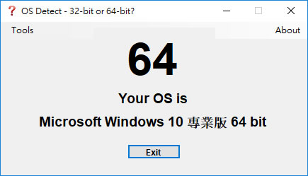 首頁電腦軟體系統應用 OS Detect 檢查 Windows 作業系統是 32位元或 64位元 Windows 作業系統有區分 32位元或 64位元,如果是 32位元就不能跑 64位元的應用程式,但 64位元的作業系統可以跑 32位元的應用程式,想要知道自己安裝的作業系統是幾位元的作業系統,最簡單的方式就是在設定視窗中的[ 關於 ]中就有載明,也可以利用 OS Detect 這個小程式來協助,執行後就會告訴你作業系統的位元數。 🔔 不錯過任何精彩! 立即訂閱我們的 LINE 官方帳號 每次發佈新文章時,您將會第一時間收到本站文章連結通知,輕鬆掌握最新資訊! 使用 LINE 追蹤文章更新 §相關文章,還可以參閱:CatLock:可鎖定鍵盤的 Windows 應用程式,防止寵物意外觸碰Zen Ad blocker 瀏覽器與應用程式均適用的廣告攔截器,免費且開放原始碼TimVer 一站式顯示 Windows 版本及電腦硬體相關訊息的工具「微軟電腦管家」內含開機啟動項目管理、儲存空間最佳化等免費工具 全方位提升電腦效能Windows Startup Timer 測量 Windows 從開機到完全啟動所需時間 如何使用OS Detect ? 1.[ Windows + I ]快速鍵來開啟設定視窗,[ 系統 ] > [ 關於 ],便可在系統類型中看出。 2.使用 OS Detect 時,只要滑鼠左鍵雙擊 OS Detect.exe 便可開啟,開啟便會顯示你作業系統位元數及其版本。 OS Detect版本:1.3.2.9語言:英文性質:免費適用:Windows官方網站:https://www.wintools.info/index.php/os-detect-32-bit-or-64-bit下載:按我下載