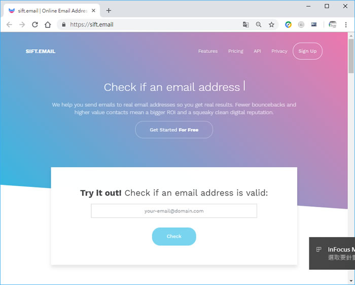 首頁線上工具郵件簡訊 Sift.email 檢查電子郵件地址是否存在、是不是臨時信箱 對需要透過電子郵件發送的電子文檔,最怕的大概就是被退件,因為當退件時,一般的設定都會有退件通知到你的電子郵件信箱內,數量一多,光刪除都覺得麻煩,如果還要去篩選哪個電子郵件地址是無效的,那可真是欲哭無淚,Sift.email 這個線上免費服務,可以幫你事先先做檢查,單一個個的輸入檢查,免費,如果要透過程式應用所提供的 API 來大量查詢,則需要付費,檢查項目包含 Email 格式、是否為臨時信箱、免費信箱以及 SMTP 郵件伺服器狀態等。 🔔 不錯過任何精彩! 立即訂閱我們的 LINE 官方帳號 每次發佈新文章時,您將會第一時間收到本站文章連結通知,輕鬆掌握最新資訊! 使用 LINE 追蹤文章更新 §相關文章,還可以參閱:MinMail Temp Mail 免費的臨時電子郵件信箱服務,24小時內有效TempMail100:快速取得可接收電子郵件的臨時信箱,輕鬆防止垃圾郵件臨時電子郵箱 Email.ML:有效期一小時,無廣告支援中文郵件22.Do:可用 gmail.com 當後綴地址的免費臨時電子郵件信箱,24小時有效期AdGuard Temp Mail:保護隱私、區分用途的免費臨時電子郵件服務 如何使用 Sift.email? 1.使用瀏覽器進入 Sift.email 網站,輸入電子郵件地址。 2.包含 Email 格式、是否為拋棄式臨時信箱、是否為免費 Email 以及 SMTP 郵件伺服器狀態等,如果顯示為笑臉 GOOD ,代表檢測結果通過,這個信箱地址是正確且可以收到信的,下圖是用 10minutemail 拋棄式免費電子郵件信箱 所產生的電子郵件地址。 Sift.email網站網址:https://sift.email/