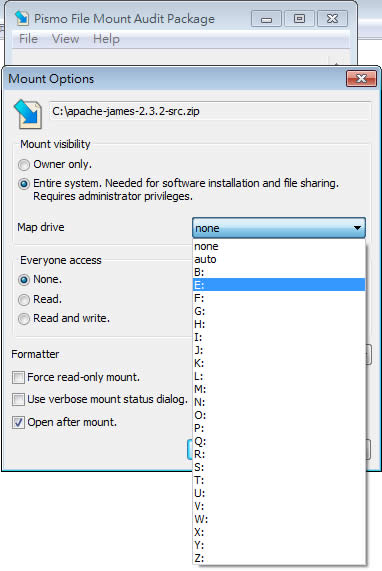 首頁電腦軟體燒錄映像 Pismo File Mount Audit Package 可掛載 ZIP 壓縮檔及 ISO 光碟映像檔的工具軟體,方便直接讀取 可掛載 ISO 映像檔的軟體有很多,像是 Virtual CloneDrive 免費虛擬光碟軟體,安裝及使用教學 及 DAEMON Tools Lite 虛擬光碟機,支援多種映像檔格式﹝繁體中文版﹞,Pismo File Mount Audit Package 也是一套可以支援 ZIP、 ISO、CISO、CFS、ISZ、DAA 及 PFO 壓縮及光碟映像檔掛載的程式,比較特別的是它支援 ZIP 的壓縮格式掛載,這對於經常使用 ZIP 壓縮來備份檔案的人來說,免去解壓縮的動作,就能讀取檔案,實在是相當方便的工具軟體。 🔔 不錯過任何精彩! 立即訂閱我們的 LINE 官方帳號 每次發佈新文章時,您將會第一時間收到本站文章連結通知,輕鬆掌握最新資訊! 使用 LINE 追蹤文章更新 §相關文章,還可以參閱:ISO Workshop 光碟映像檔製作、轉換、燒錄與解開免費工具BurnAware Free 免費燒錄光碟的軟體(CD、DVD與藍光光碟片)VirtualDVD 虛擬光碟機,輕鬆掛載 img, iso, ccd, bin, mds, mdf, nrg...等光碟映像檔CDBurnerXP 免費燒錄軟體(繁體中文版)DAEMON Tools Lite 免費虛擬光碟機,支援多種映像檔格式﹝繁體中文版﹞ 如何使用 Pismo File Mount Audit Package ? 1.安裝完成後,若想快速掛載,在 Pismo File Mount Audit Package 所支援的檔案格式上點擊滑鼠右鍵,在其右鍵功能表中,點擊[Quick mount]。 2.原本的檔案格式,就會變成一個資料夾,且可供讀取。 3.若想解除掛載,在其檔案上,一樣點擊滑鼠右鍵,在其功能表上,點擊[Unmount]即可解除。 4.若想使用掛載成磁碟機,可依照第1個步驟,選擇[Mount...]或點擊[開始]功能表, 5.開啟後,點擊[File] > [Mount],在其出現的視窗中找到想要掛載的檔案後,接下來就會出現Mount Options 設定視窗,在Map drive選擇一個磁碟機代號,並可在其下方的Everyone access權限中,點選要開放的權限,設定好之後點擊[Mount]。 6.掛載後。 Pismo File Mount Audit Package版本:build 192語言:英文性質:免費適用:Windows官方網站:https://pismotec.com/pfm/ap/下載:按我下載