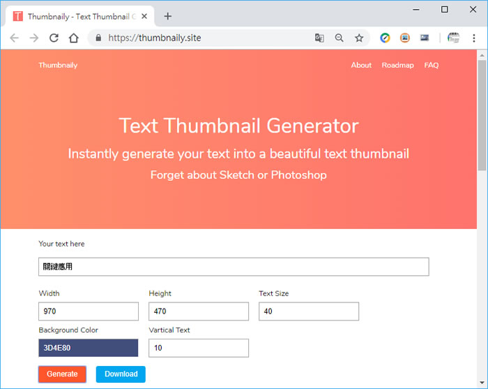 首頁線上工具影像繪圖 Thumbnaily 線上文字圖片產生器 想要在圖片上加入文字,看似簡單的動作,卻也還是需要像小畫家這樣類似工具才能做得出來,Thumbnaily 是個免費的線上文字圖片產生器,用戶可以自訂要顯示的文字、圖片大小、背景色、文字大小等,輸入文字後,可以線上即時預覽,滿意後就可以下載成 PNG 的圖檔格式,免註冊、免跳轉網頁,簡單方便。 🔔 不錯過任何精彩! 立即訂閱我們的 LINE 官方帳號 每次發佈新文章時,您將會第一時間收到本站文章連結通知,輕鬆掌握最新資訊! 使用 LINE 追蹤文章更新 §相關文章,還可以參閱:Google 親自示範:Nano Banana AI 圖像編輯工具的 13 個熱門玩法照片角度不滿意?AI 幫你調整!3D Camera Control 讓舊照片任意變換視角Meta AI 免費帳戶也能用 Midjourney!無限生成 AI 圖片,台灣可用Nano Banana Pro 幫你放煙火,地點、形狀由你指定Mock.Club:免費 AI Mockup 素材庫,拖曳截圖立即生成專業展示圖 如何使用 Thumbnaily ? 1.使用瀏覽器進入 Thumbnaily 網站,輸入要顯示的文字,自訂圖片大小、背景色、文字大小等,便可按[ Generate ]來產生預覽圖。 2.滿意後,按[ Download ]便可下載。 Thumbnaily網站網址:https://thumbnaily.site/