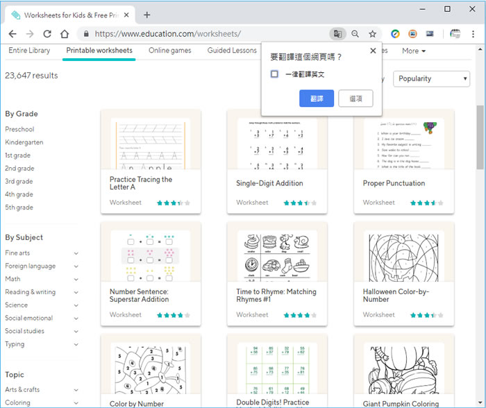 首頁教育學習數學 Education.com 提供兒童美術、數學、外語等多元教育範本,完全免費,歡迎下載 在學齡前的幼兒,家長通常會去買些ㄅㄆㄇㄈ、1234,ABCD 等點描字或是一些空白圖案來讓小朋友練習或塗顏色,有些家長還會準備像是簡單的加減法練習簿,無非就是希望開啟小朋友的學習之路,能贏在起跑點,而這些教育範本不一定要去購買,如果家中有自備印表機,強烈建議你可以到 Education.com 這個網站來尋找適合家中幼兒的學習範本,該網站從幼兒、幼兒園、國小各年級包含美術、外語、數學、閱讀及寫作、科學、打字、社交...等等提供一系列的教育範本,家長可以自行下載、列印出來,讓小朋友自行練習,有了這些教育範本,家長可以規劃小朋友的學習課程,不要再給小朋友手機、平板的讓小朋友自行打發時間了。 🔔 不錯過任何精彩! 立即訂閱我們的 LINE 官方帳號 每次發佈新文章時,您將會第一時間收到本站文章連結通知,輕鬆掌握最新資訊! 使用 LINE 追蹤文章更新 §相關文章,還可以參閱:Math Bot:GPT-4o 支援的 AI 數學求解器,提供詳細解題步驟Mathic:免費線上加減乘除運算式組合練習平台,挑戰四則運算極限AI Math:免費數學學習AI工具,詳列解題過程並提供解說Microsoft Math Solver 代數、三角函數及微積分等數學題目的最佳解題工具,不僅有答案、步驟還會出練習題「算術題、口算題在線生成器」快速產生加、減、乘、除數學練習題目 如何使用 Education.com ? 1.使用瀏覽器進入 Education.com 網站,便可看到其分類,如果閱讀英文有障礙,也可以透過瀏覽器內建的翻譯功能來輔助。 2.每個項目都會有適用年齡層的標示,下載時會需要登入,可以使用 FaceBook 或是 Google帳號來登入。 education.com網站網址:https://www.education.com/worksheets/