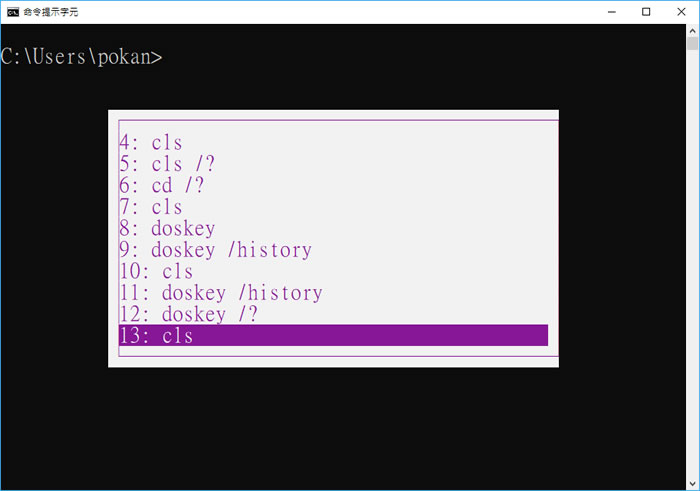 2.查看所輸入過的指令,有 2 種方式,一種是輸入 DOSKEY 後面接 /history 參數。