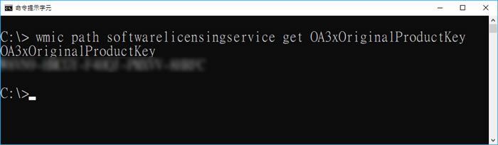 首頁操作技巧Windows 指令 如何用「命令提示字元」查詢 Windows 產品金鑰? Windows 產品金鑰是安裝與啟用 Windows 作業系統的重要依據,其格式為 25 個字元代碼,看起來會是像這樣:XXXX-XXXXX-XXXXX-XXXXX-XXXXX,要想查詢該產品金鑰,可以使用像是 PK Finder 、 SterJo Windows Key Finder 或是 Wise Windows Key Finder 等在內的第三方應用程式來協助,也可以利用「命令提示字元」輸入指令來查詢。 🔔 不錯過任何精彩! 立即訂閱我們的 LINE 官方帳號 每次發佈新文章時,您將會第一時間收到本站文章連結通知,輕鬆掌握最新資訊! 使用 LINE 追蹤文章更新 §相關文章,還可以參閱:如何在 Windows 中一次建立多個資料夾如何在 Windows 中使用 PowerShell 列出軟體安裝與解除安裝記錄如何使用「命令提示字元」或「PowerShell」指令取得目前 CPU 溫度?「命令提示字元」如何使用指令執行 SSD 硬碟速度測試?「Windows PowerShell」如何將指令結果直接輸出成文字檔? 如何用「命令提示字元」查詢 Windows 產品金鑰? 1.開啟「命令提示字元」,輸入 wmic path softwarelicensingservice get OA3xOriginalProductKey 指令後,按鍵盤[ Enter ]鍵,就會顯示 像這樣格式 XXXX-XXXXX-XXXXX-XXXXX-XXXXX 的 Windows 產品金鑰。 2.要了解 wmic path softwarelicensingservice get OA3xOriginalProductKey 該指令的詳細用法,可以在其後加一空格後接上 /?來取得。