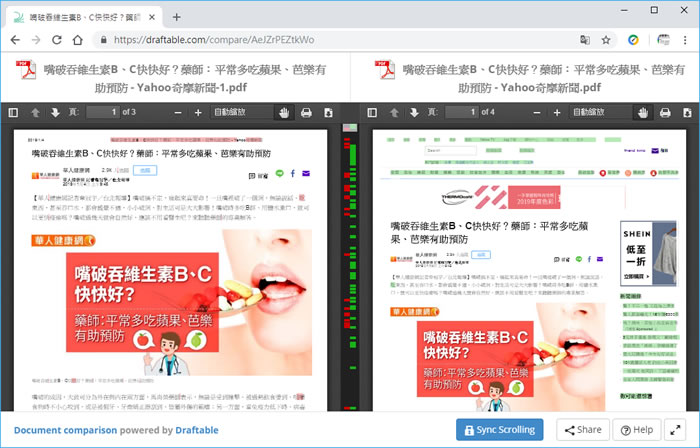 首頁線上工具檔案管理 Draftable Online Compare 線上幫你比對兩份文件內容不同之處 文件檔案如果沒有版本號,要找出同份文件有任何不同之處,實在是有點吃力的工作,尤其又是內容很多的時候,所以,有需求就會有輔助工具,Draftable Online Compare 是個線上文件比對的免費工具,可以比較 Word、PowerPoint 及 PDF 的檔案內容,操作也相當簡單,只需將要比對的文件,使用滑鼠拖拉進網頁指定位置,就會幫你進行比對,比對頁數可高達 300頁,不同的內容會有顏色標示出,方便你後續的調整。 🔔 不錯過任何精彩! 立即訂閱我們的 LINE 官方帳號 每次發佈新文章時,您將會第一時間收到本站文章連結通知,輕鬆掌握最新資訊! 使用 LINE 追蹤文章更新 §相關文章,還可以參閱:VERT:開源本地端檔案格式轉換器,隱私優先的免費瀏覽器轉檔工具PageSplitty 線上 PDF 分割轉 JPG、PNG、WebP 圖工具,支援 5GB 大小的大檔案PixDuplicate:免上傳快速找出並刪除重複照片的免費線上工具Adapter:全方位影片、音檔及圖片格式轉換免費軟體,支援影片轉音檔與圖片,音檔及圖片格式互轉TextCompare 線上比較 Excel、PDF 及圖片,快速找出檔案不同之處 如何使用 Draftable Online Compare? 1.使用瀏覽器進入 Draftable Online Compare 網站,將要比較的兩份文件,分別使用滑鼠拖拉進編號 1與 2 的位置。 2.完成 1及 2步驟,就可以按[ Compare documents ],兩份文件不同處,會用顏色標示出,方便用戶後續的調整。 Draftable Online Compare網站網址:https://draftable.com/compare